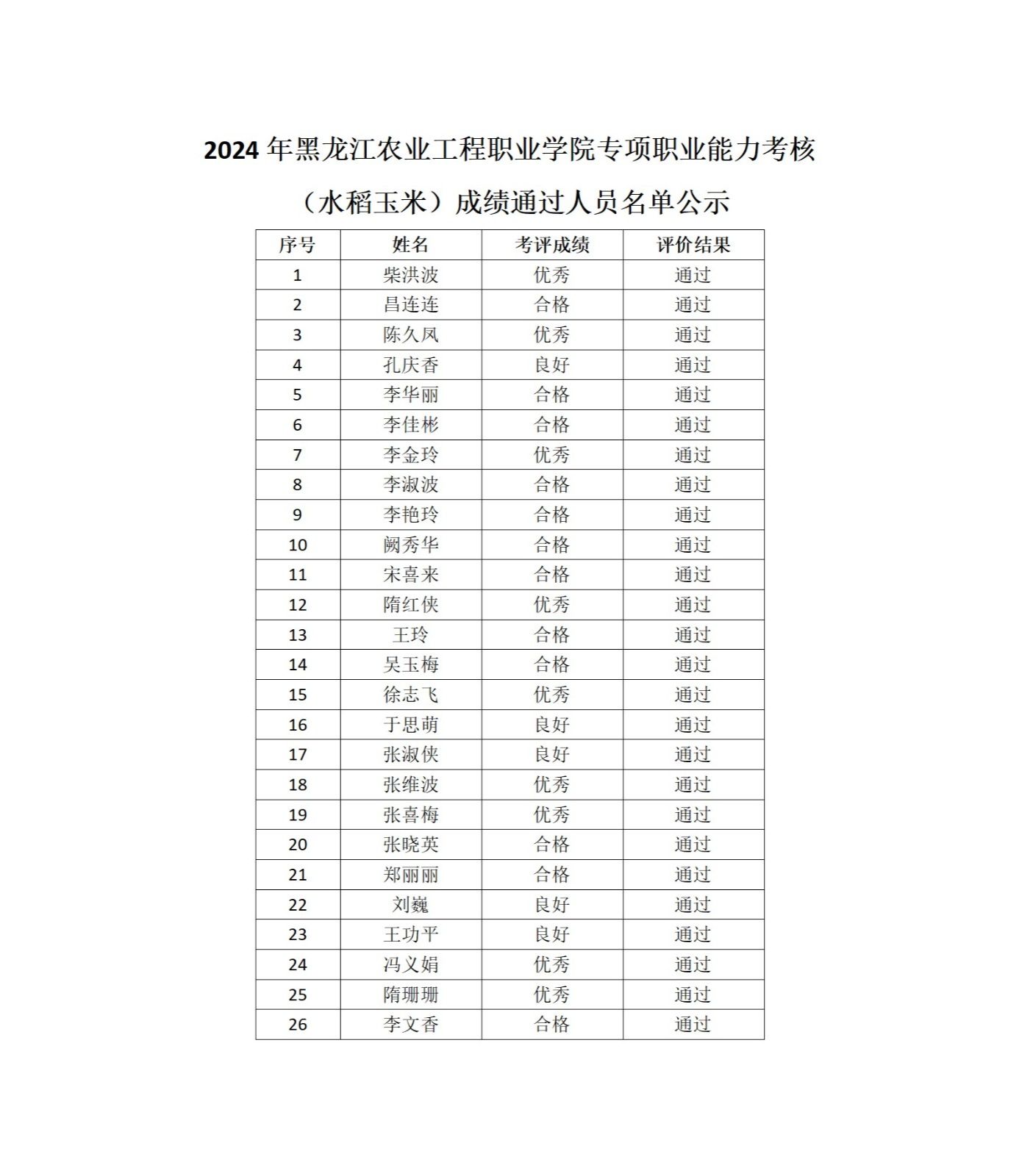 根据《关于改革完善技能人才评价制度的意见》(人社部发〔2019〕90号)、《关于开展社会化专项职业能力考核认定的通知》(黑人社函〔2024〕6号)、《关于转发<关于开展社会化专项职业能力考核认定的通知>的通知》(哈人社函〔2024〕2号)精神。2024年11月15日我院组织了一期专项职业能力考核(水稻玉米)工作。通过考核,其中26人成绩合格(具体名单附后)。现面向社会予以公示。公示时间:2024年11月21日—11月27日(5个工作日)。如有异议,可在公示期内反映,反映情况和问题必须实事求是,应签署或告知真实姓名、工作单位和联系方式,对线索不清的匿名信或匿名电话,公示期间不予受理。 受理电话:0451-51604333。