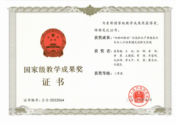 专业实施“双导师、三阶段、四融合、全过程”人才培养模式,根据渔业生产季节和养殖生产过程安排教学内容,校内学业导师和企业实践导师共同对学生的专业课程进行做、学、教一体化教学,校企共育提升学生的职业能力、磨炼精湛技能,培养新型技术技能人才。专业教学成果获国家级教学成果二等奖1项。