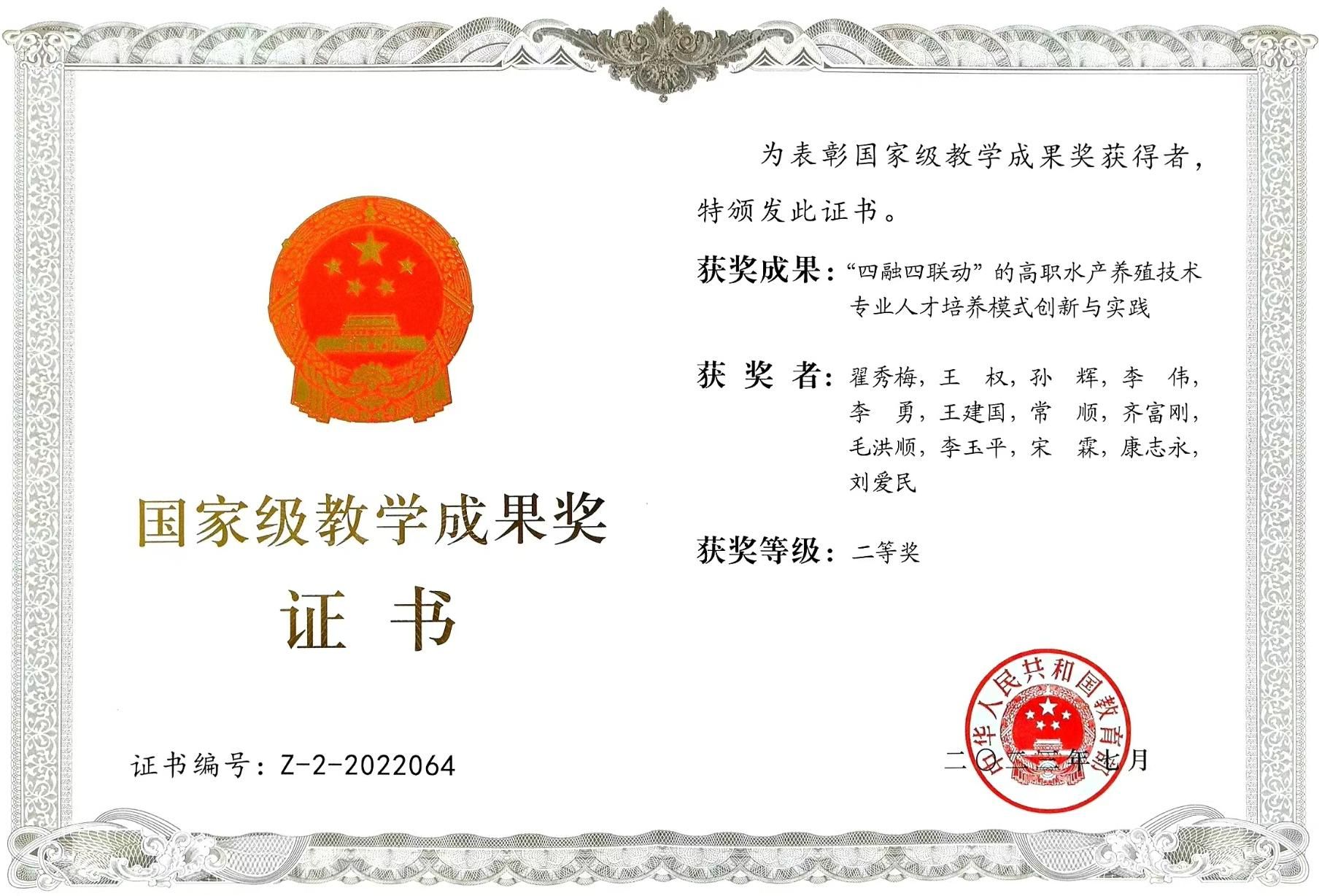 国家级教学成果奖证书