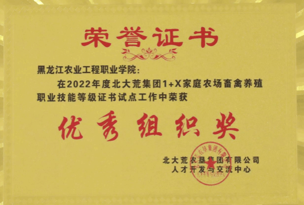 北大荒基团1+X家庭农场畜禽养殖职业技能等级证书试点工作中荣获优秀组织奖