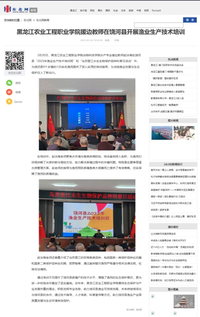 【媒体聚焦】东北网报道:万象城allwincity官网援边教师在饶河县开展渔业生产技术培训