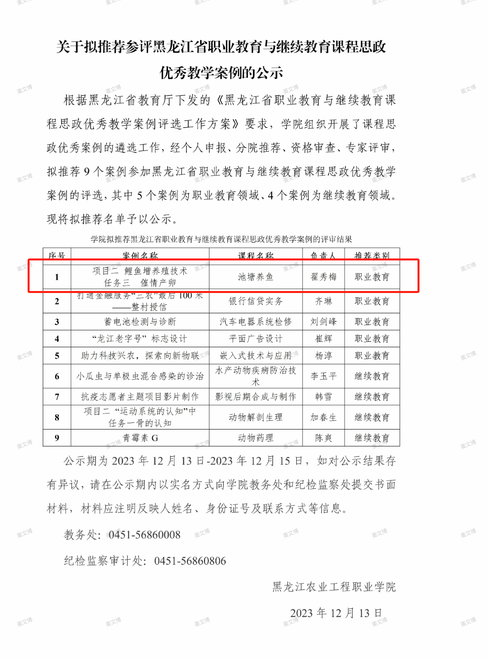 我院《池塘养鱼》课程拟推荐参评黑龙江省职业教育与继续教育课程思政优秀教学案例的公示