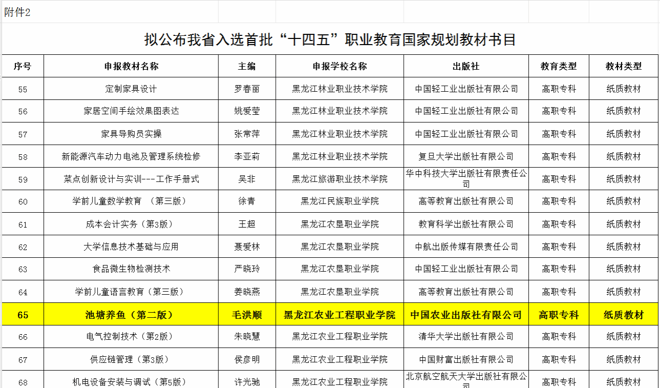 根据教育部有关政策要求和《关于开展黑龙江省“十四五”职业教育规划教材遴选工作的通知》部署,我厅组织开展黑龙江省“十四五”职业教育规划教材遴选工作。经学校申报、专家评审,拟认定黑龙江省“十四五”职业教育规划教材127种(部);对已入选“十四五”职业教育国家规划教材115种(部)进行复核,现予以公示。公示期为2024年7月9日至2024年7月15日。公示期内对公示名单有异议的,单位或个人应当以书面方式提出,并提供必要的证明材料及有效联系方式。以单位名义提出的,须在书面材料上加盖本单位公章;个人提出的,须签署真实姓名,否则不予受理。