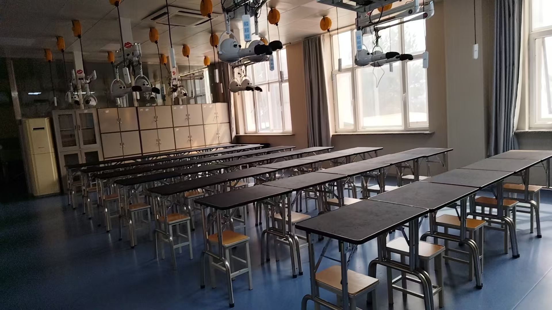 实训室拥有热水器、宠物浴缸、宠物spa机、吹风机、吹水机、标准美容台、液压美容台、宠物创染套装、宠物spa套装、宠物精油套装等设备。