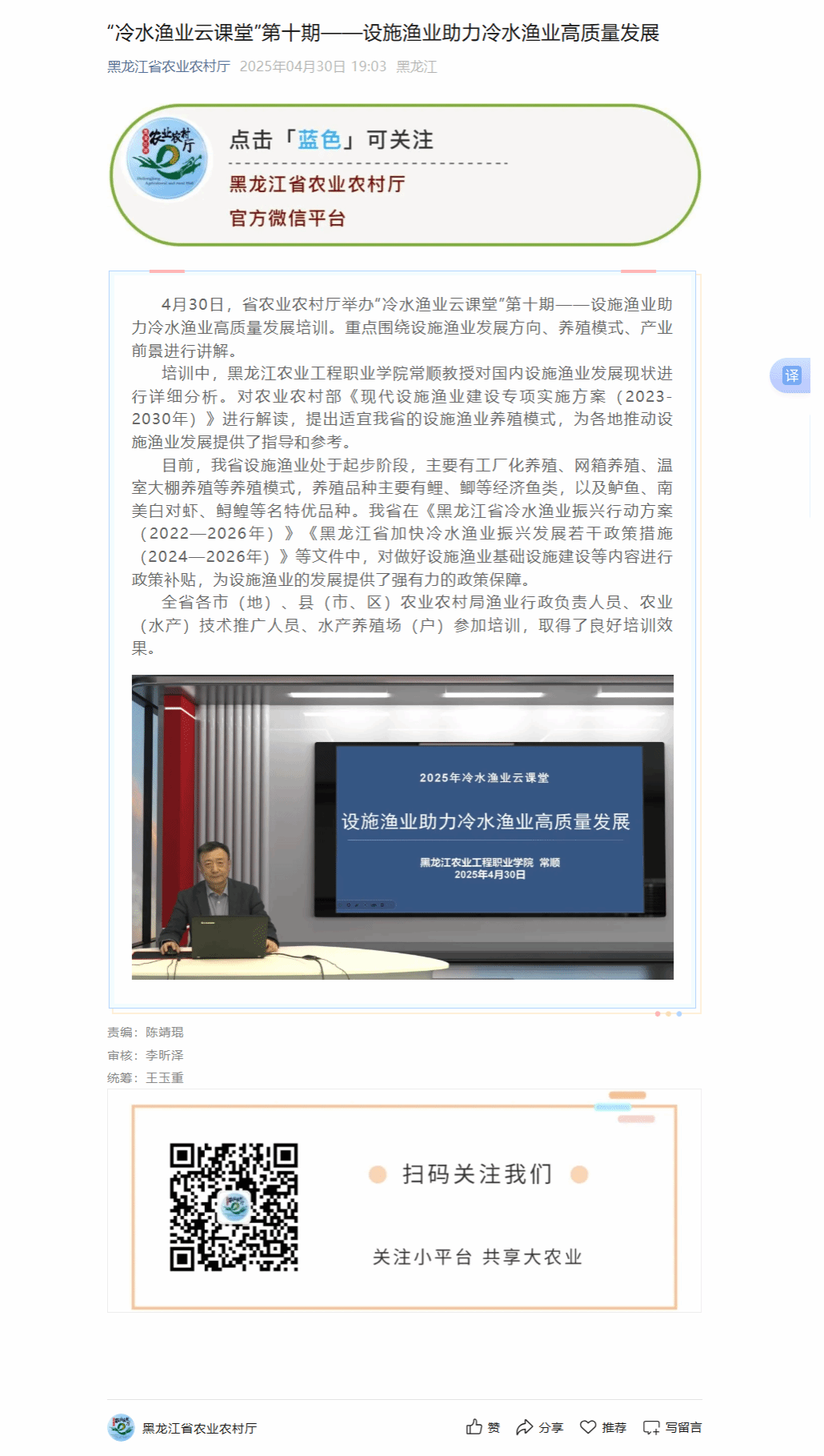 【媒体聚焦】黑龙江省农业农村厅官方微信平台报道:“冷水渔业云课堂”第十期——设施渔业助力冷水渔业高质量发展