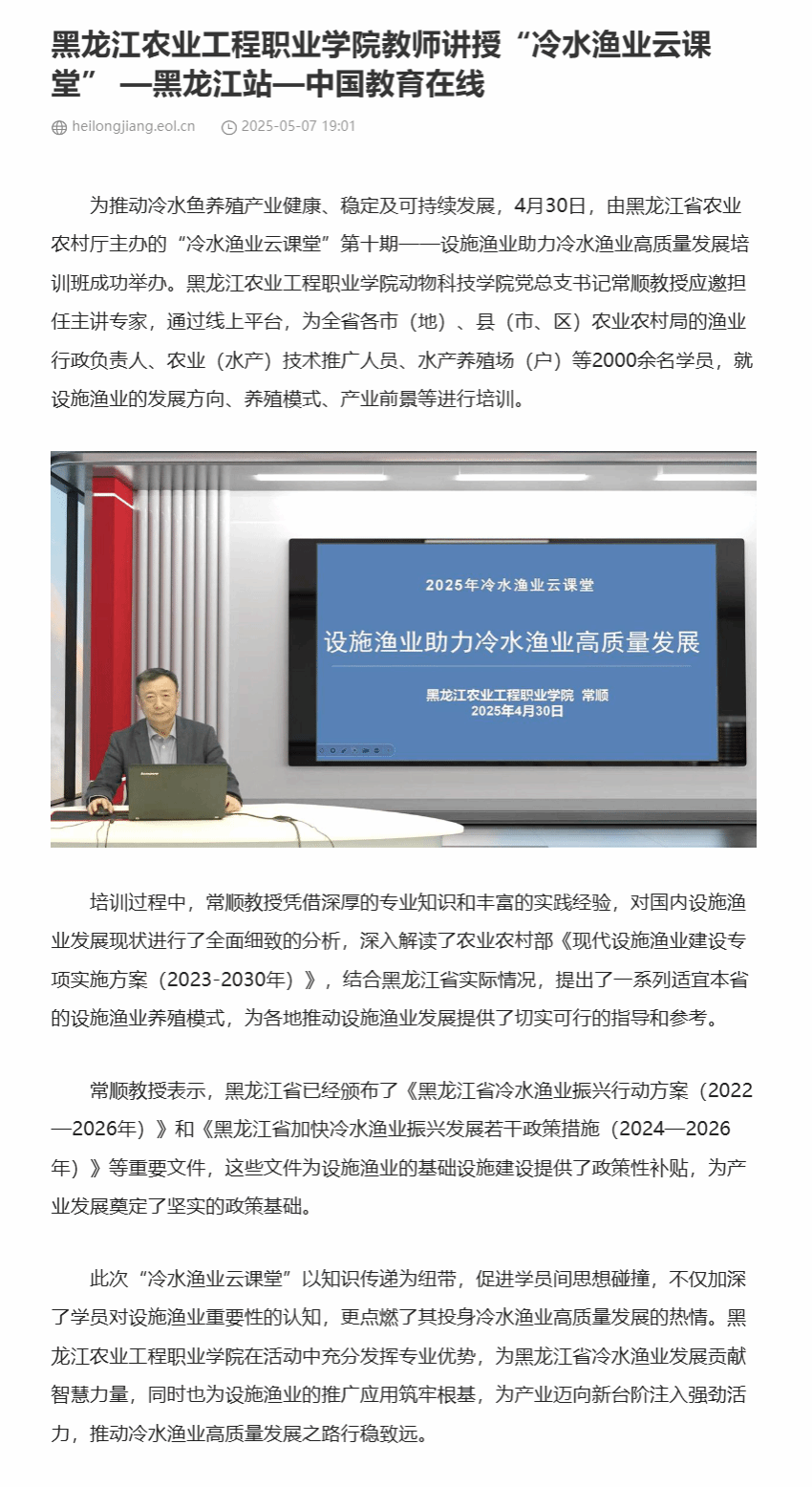 【媒体聚焦】中国教育在线报道:万象城allwincity官网教师讲授“冷水渔业云课堂”