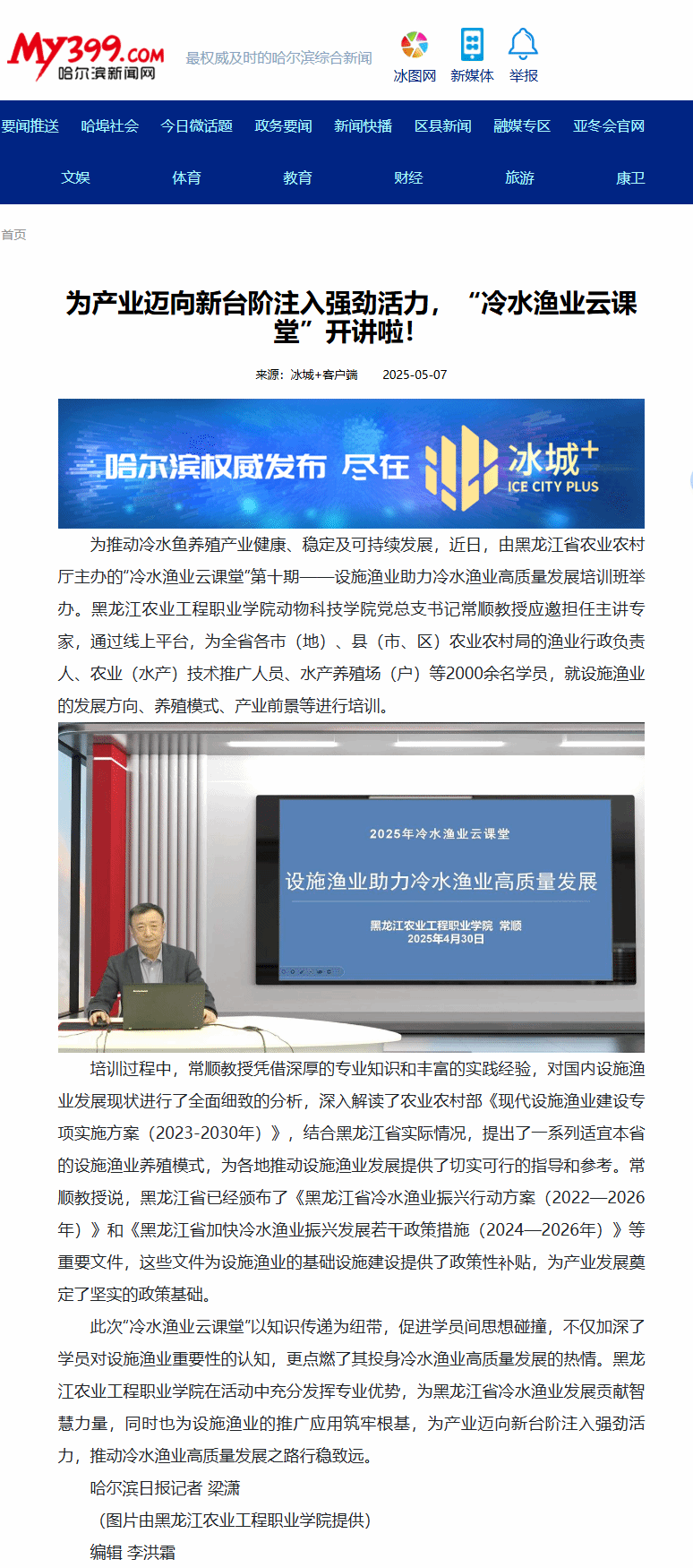 【媒体聚焦】哈尔滨新闻网报道:为产业迈向新台阶注入强劲活力,“冷水渔业云课堂”开讲啦!