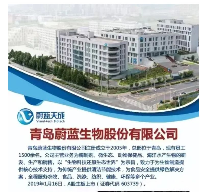 青岛蔚蓝天成生物科技有限公司是青岛蔚蓝生物股份有限公司(证券代码603739)的全资子公司,蔚蓝天成以集团的技术研发和生产基地为强大的技术和生产后盾,在产品方面以混合型饲料添加剂、功能型微生态、定向营养免疫制剂为主,配套化学型水质改良及底质改良产品。