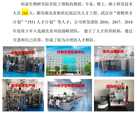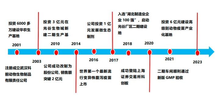 公司简介武汉科前生物股份有限公司(以下简称“科前生物”)成立于 2001 年,由华中农业大学和华农动科动医学院的老师、专家共同创办,专注于动物生物制品研发、生产、销售及动物防疫技术服务,在国内非强制免疫猪用疫苗市场排名第一。科前生物是国家发改委授予的“国家高新技术产业化示范工程”重点高新技术企业、湖北省首批创新型试点企业、2018、2019、2021 三度入选“湖北制造业企业 100 强”。科前生物于 2020 年 9 月 22 日在上交所科创板成功挂牌上市。