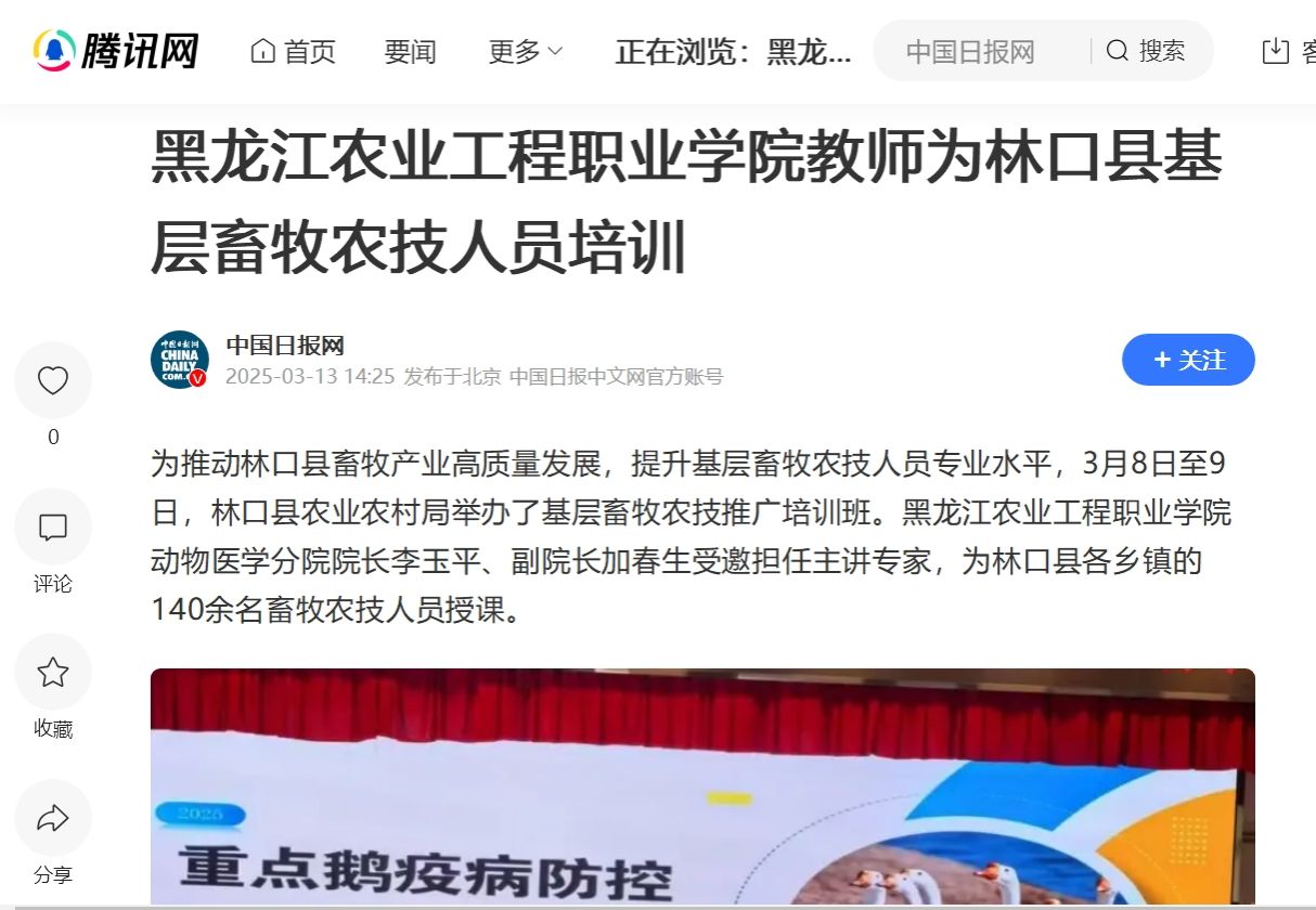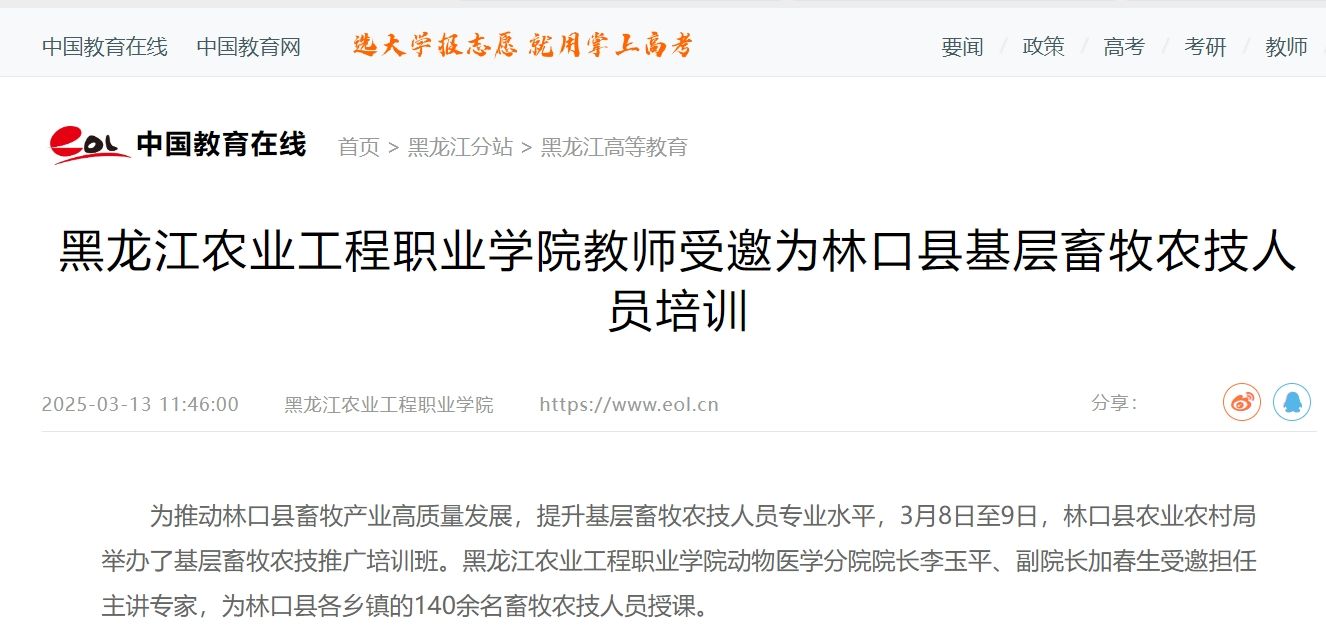 此次多家媒体的转载,充分彰显了动物医学分院在科技服务培训领域的深远影响和重要地位,也反映了社会对高校教师利用专业知识助力地方产业发展的高度认可。这不仅提升了动物医学分院的社会知名度,更为高校与地方深入合作、助力乡村振兴树立了良好典范,激励更多教师积极投身于地方经济建设和农业发展的科技服务之中。