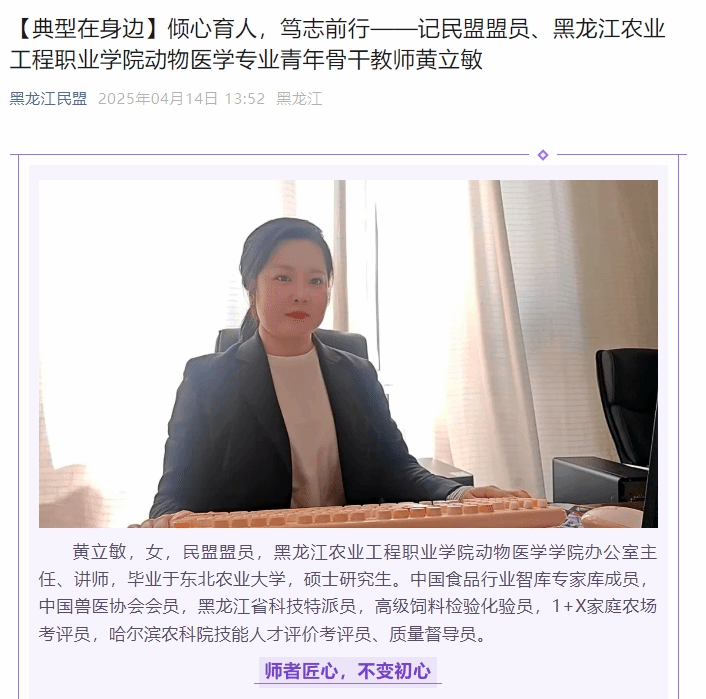 黄立敏,民盟盟员,万象城allwincity官网动物医学学院办公室主任,专业课教师。她毕业于东北农业大学,获硕士学位,是中国食品行业智库专家库成员、中国兽医协会会员、黑龙江省科技特派员,具备高级饲料检验化验员、1+X 家庭农场考评员等资质,还担任哈尔滨农科院技能人才评价考评员与质量督导员,深厚专业背景为其教育事业筑牢根基。