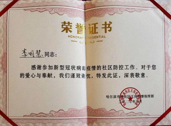 寒假期间,饮食服务中心李明慧老师志愿参加所在社区的疫情防控工作,登记社区返回人员的基本情况,提醒群众做好防护,监督居家隔离人员等,为社区群众建起一道安全防线。