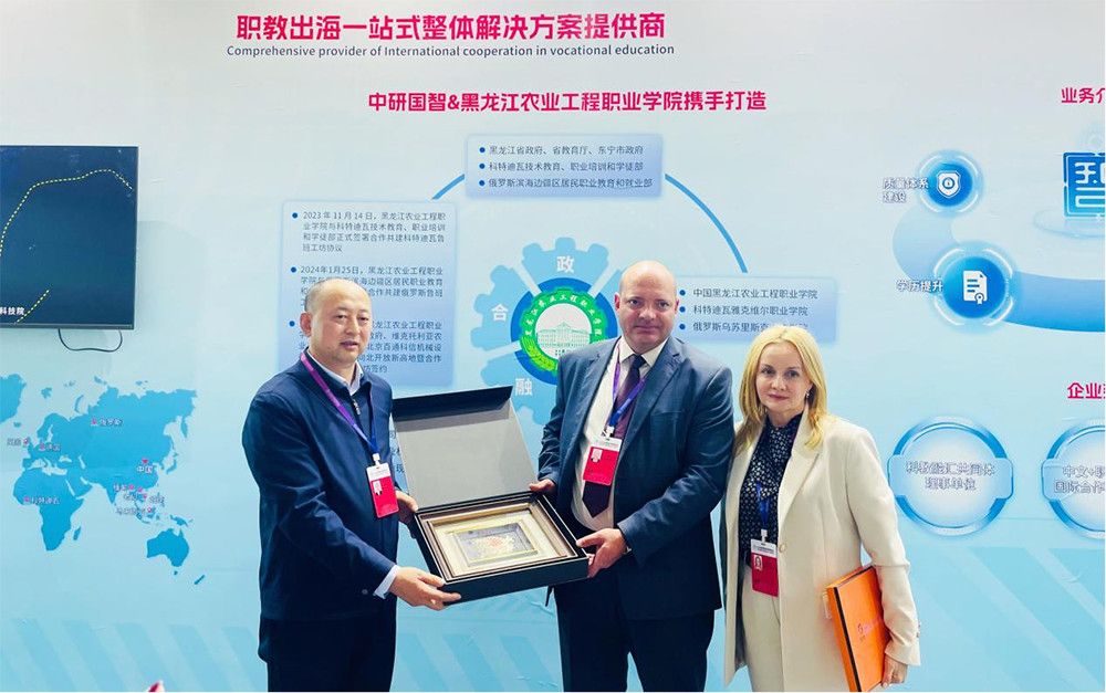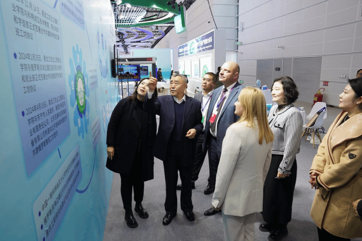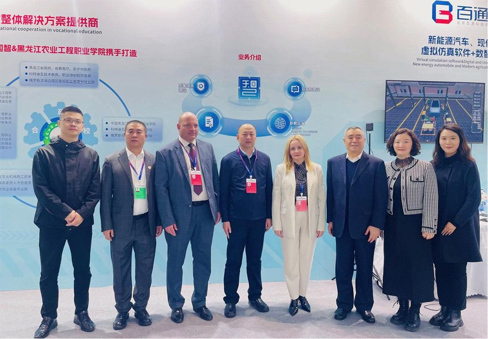我院同俄罗斯鲁班工坊(开物工坊)企业合作方北京百通科信机械设备有限公司携手参展,展示了校企政三方在职教出海、服务向北开放方面的合作成果。黑龙江省教育厅职成处处长杜海军及俄罗斯合作方代表参观了我院的展位。