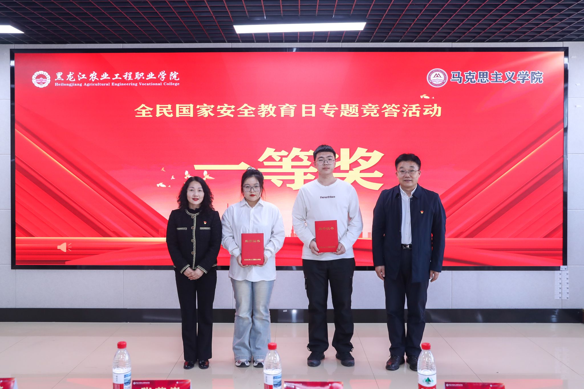 讲座现场,与会领导为学校2025年全民国家安全教育日线上专项竞答活动的获奖同学进行了颁奖。这次线上竞答活动由马克思主义学院主办、学校宣传统战部融媒体中心给予技术支持,吸引了3500多名学生参与全民国家安全教育日线上知识竞答。同学们在马克思主义学院全体教师的积极倡导下,通过自主学习国家安全相关知识,踊跃参与竞答活动,加深了广大青年学生对总体国家安全观的深入理解和准确把握,树立国家安全底线思维,理解中国特色国家安全体系,共同维护国家安全。