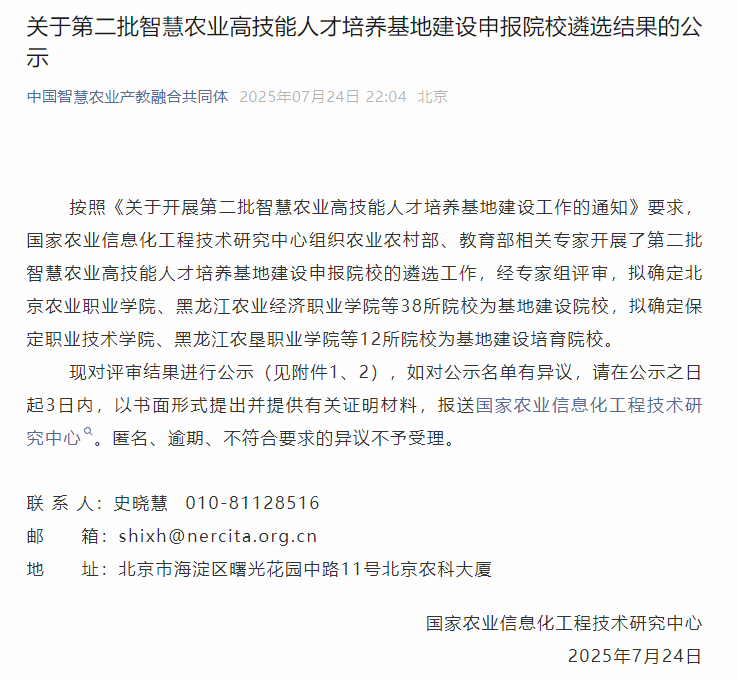 近日,国家农业信息化工程技术研究中心公布第二批智慧农业高技能人才培养基地建设院校名单,万象城农业装备学院申报的“智慧农业高技能人才培养基地”,凭借在智慧农业领域的突出成果与创新实践,从全国众多申报院校中脱颖而出,成功入围基地建设院校,成为东北地区智慧农业高技能人才培养的重要标杆。