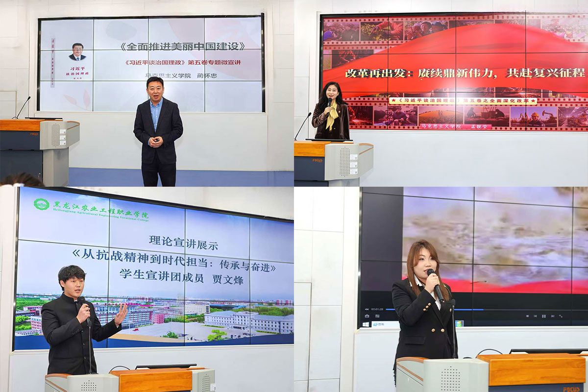 启动仪式现场同步开展首场理论宣讲展示,四场宣讲兼具理论高度与情感温度,赢得现场阵阵掌声:形势与政策教研室蔺怀忠老师围绕《全面推进美丽中国建设》主题,结合党的二十届四中全会精神,从生态屏障构建、碳达峰碳中和等维度,深入解读我国绿色发展的鲜明底色;新思想教研室孟靓莹老师以《改革再出发:赓续鼎新伟力 共赴复兴征程》为题,系统诠释新时代改革开放的磅礴伟力与深远意义;水产养殖技术2025-1班郎梦茹同学深情讲述“八女投江”的抗战故事,让师生在红色记忆中汲取奋进力量;智能焊接技术2025-1班贾文烽同学以《从抗战精神到时代担当:传承与奋进》为题,探讨新时代青年如何将红色基因转化为履职尽责的使命担当。