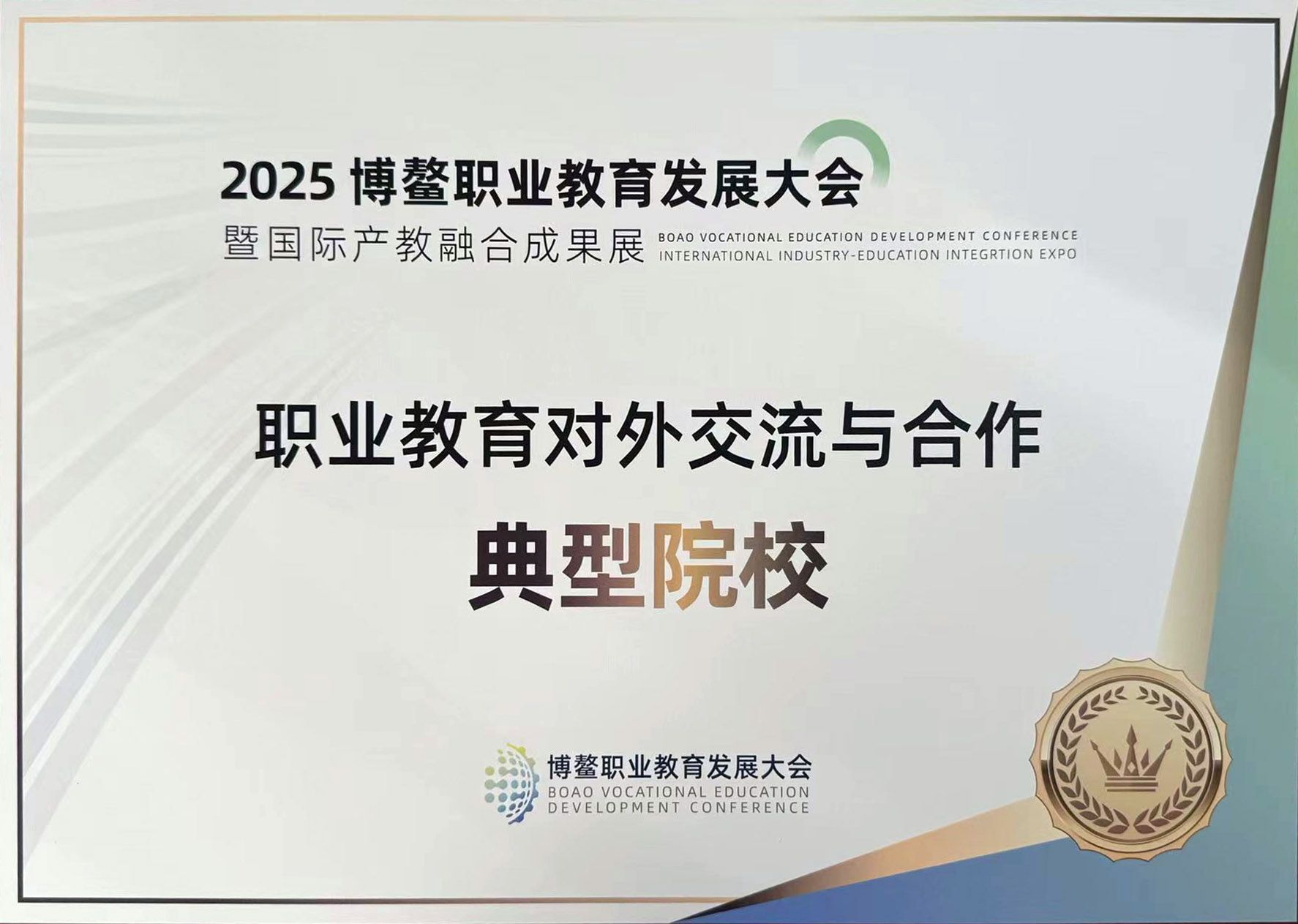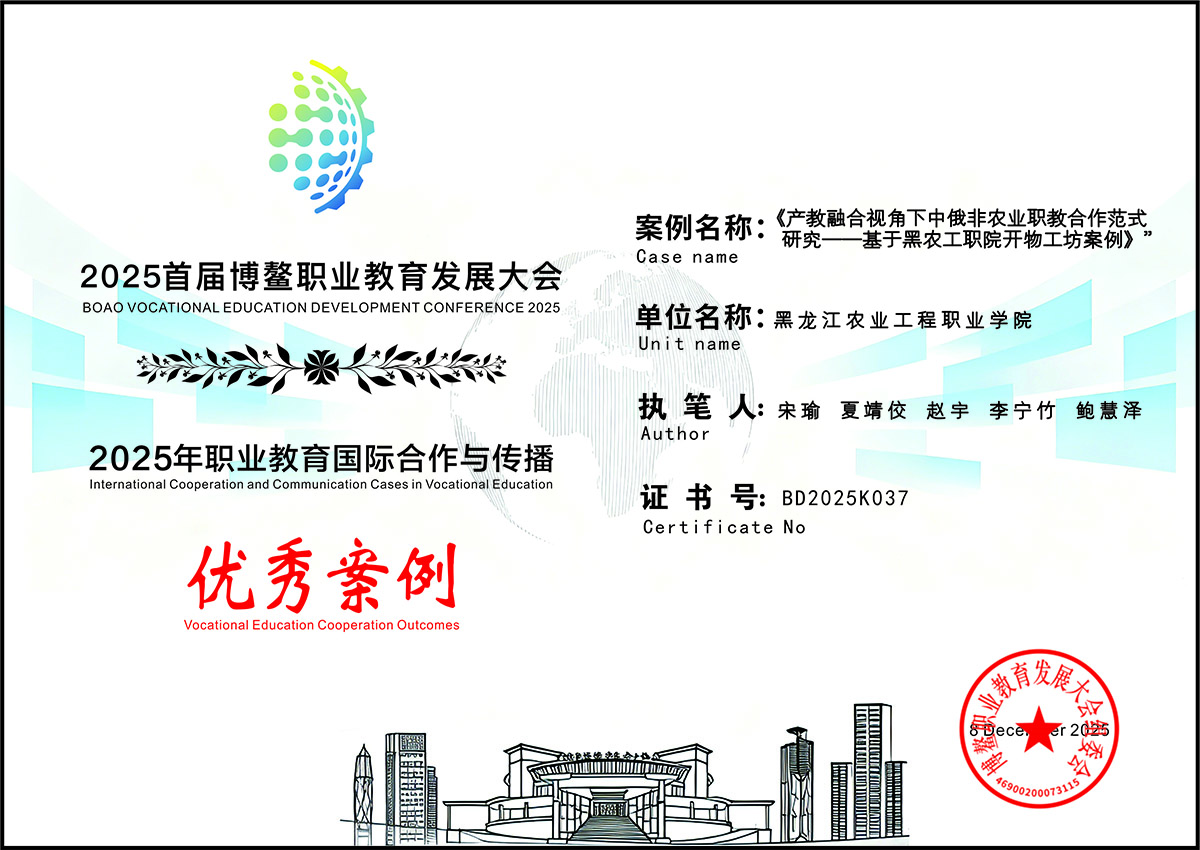 近日,以“国际合作高水平、产教融合高质量”为主题的首届博鳌职业教育发展大会在海南博鳌举行。在大会成果发布环节,万象城荣获两项荣誉:成功入选“职业教育对外交流典型院校”;《产教融合视角下中俄非农业职教合作范式研究——基于黑农工职院开物工坊案例》获评“2025年职业教育国际合作与传播优秀案例”。