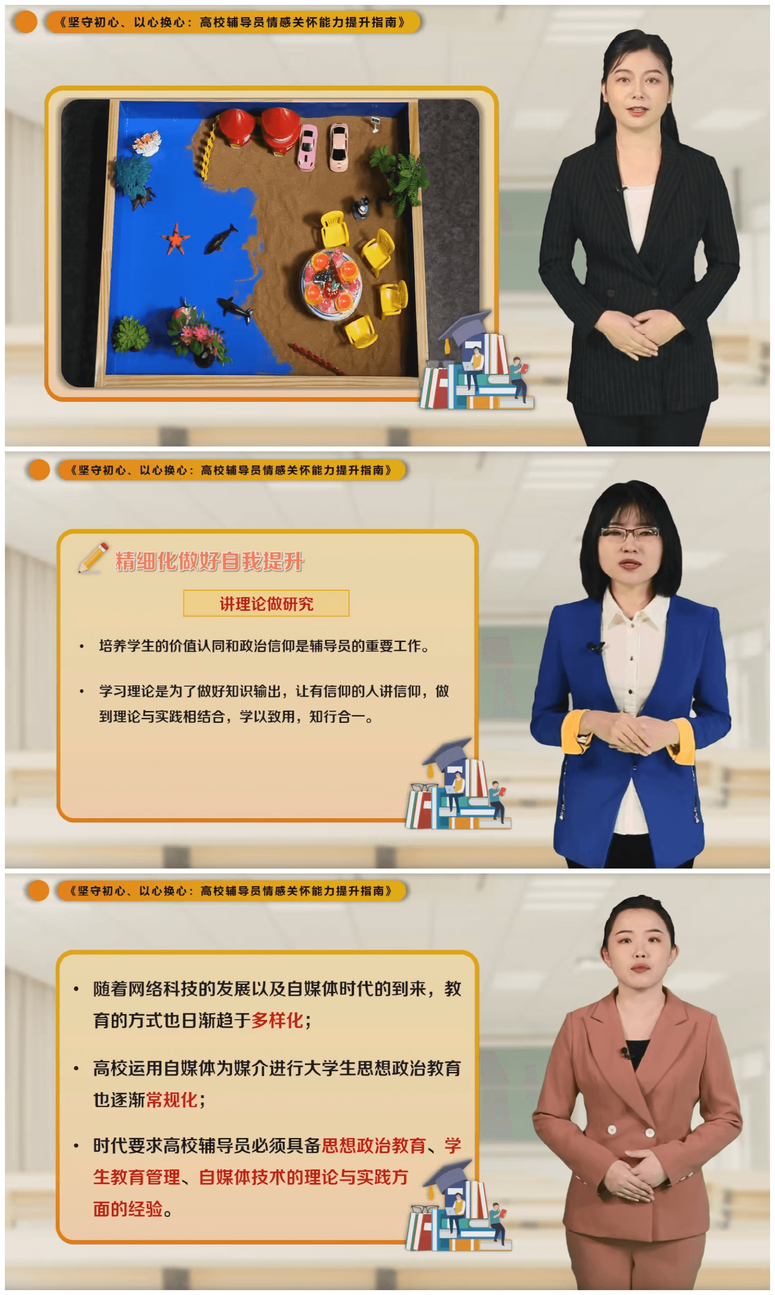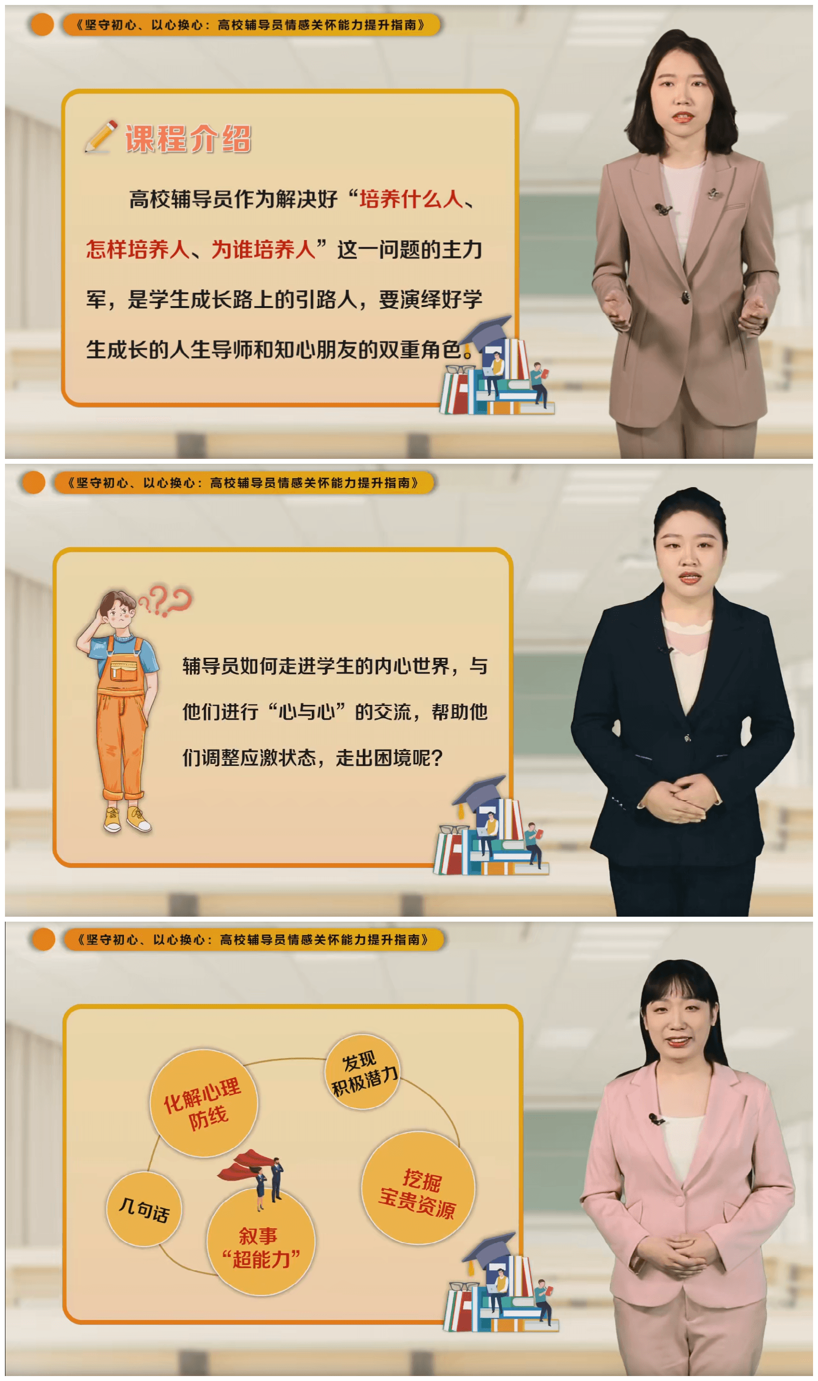 自立项以来,我院松北校区学生工作部课程项目建设团队积极研讨、总结经验、有序推进、精心录制,以积极心理学等理论为依托,分析高校辅导员的使命责任、奋斗定位与能力要求,解答新时期高校辅导员如何做好学生情感关怀,帮助高校辅导员缓解“本领焦虑”。