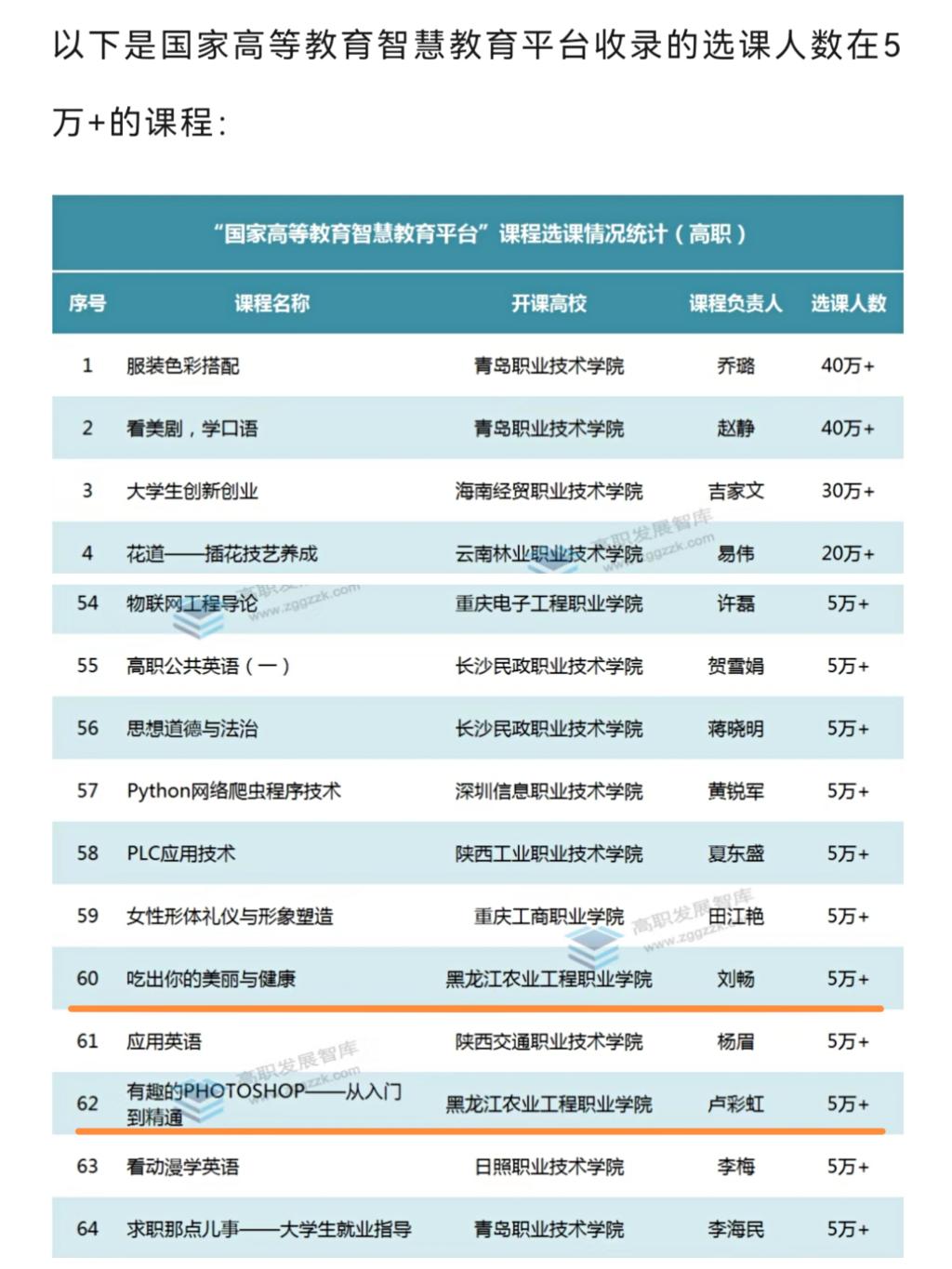 近日,国家智慧教育平台正式上线运行,其中的国家高等教育智慧教育平台,是全球课程规模最大、门类最全的国家高等教育智慧教育平台。截至2022年4月,全国共有311所高职院校的1945门优质课程入驻国家高等教育智慧教育平台。我院有52门课程成功入选,成为首批国家级优质课程,其中南岗校区11门、松北校区41门,我院入选课程数量在全国高职院校中排名第三。根据平台显示,从课程参加学生人数来看,选课人数在5万+的课程共有67门,我院卢彩虹和刘畅老师的课程位列其中。