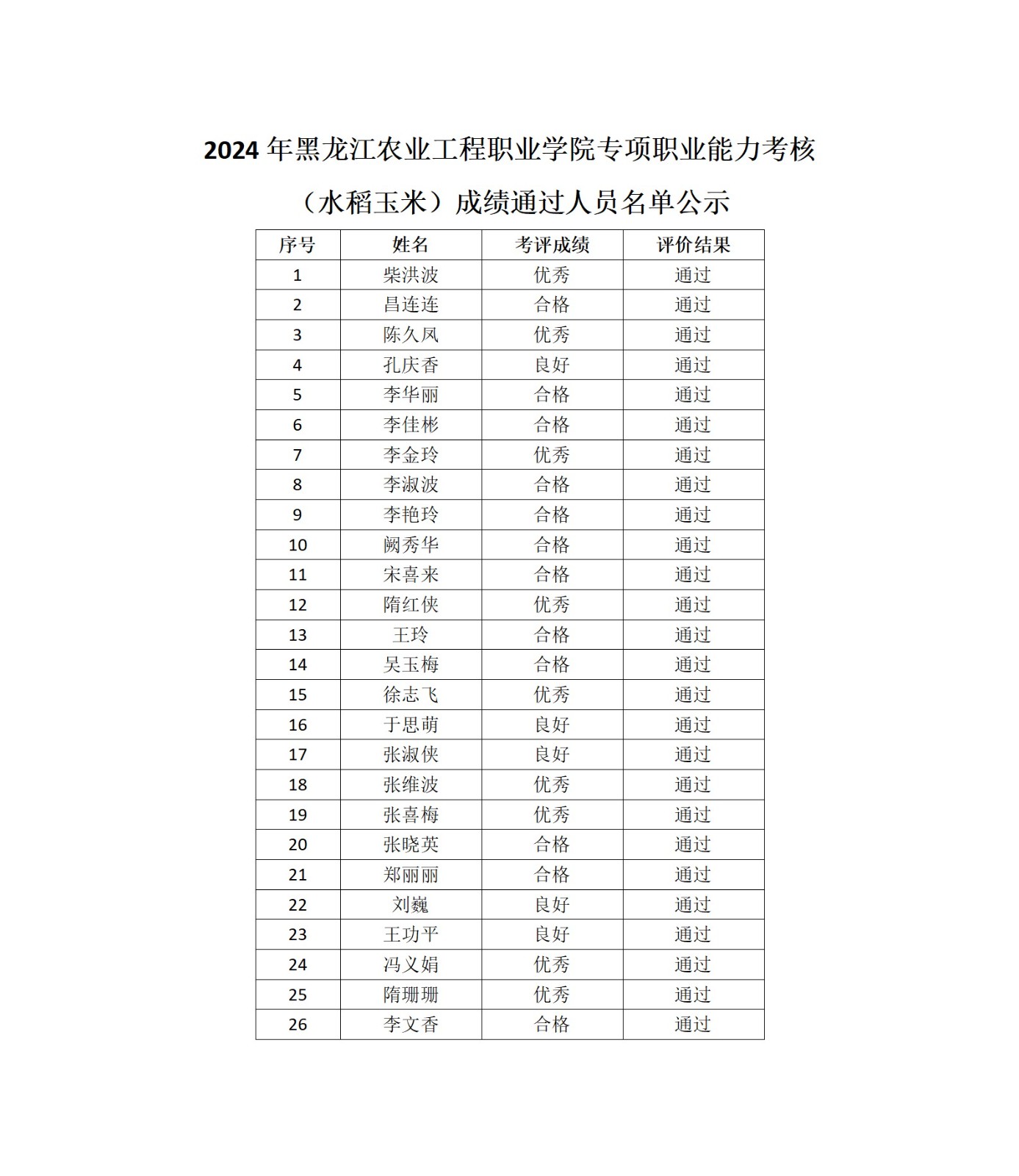 根据《关于改革完善技能人才评价制度的意见》(人社部发〔2019〕90号)、《关于开展社会化专项职业能力考核认定的通知》(黑人社函〔2024〕6号)、《关于转发<关于开展社会化专项职业能力考核认定的通知>的通知》(哈人社函〔2024〕2号)精神。2024年11月15日我院组织了一期专项职业能力考核(水稻玉米)工作。通过考核,其中26人成绩合格(具体名单附后)。现面向社会予以公示。公示时间:2024年11月21日—11月27日(5个工作日)。如有异议,可在公示期内反映,反映情况和问题必须实事求是,应签署或告知真实姓名、工作单位和联系方式,对线索不清的匿名信或匿名电话,公示期间不予受理。