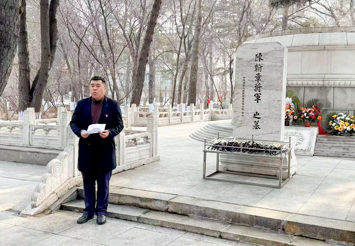 墓冢埋忠骨,鲜花敬俊雄。活动开始,全场庄严肃穆,全体党员脱帽,向烈士默哀。默哀结束,全体人员拿起扫帚,认真清理墓碑附近的落叶和杂物,并向烈士纪念碑敬献鲜花。党员们手持鲜花,依次走到纪念碑前敬献鲜花,表达对革命先烈的无限敬仰和追思。