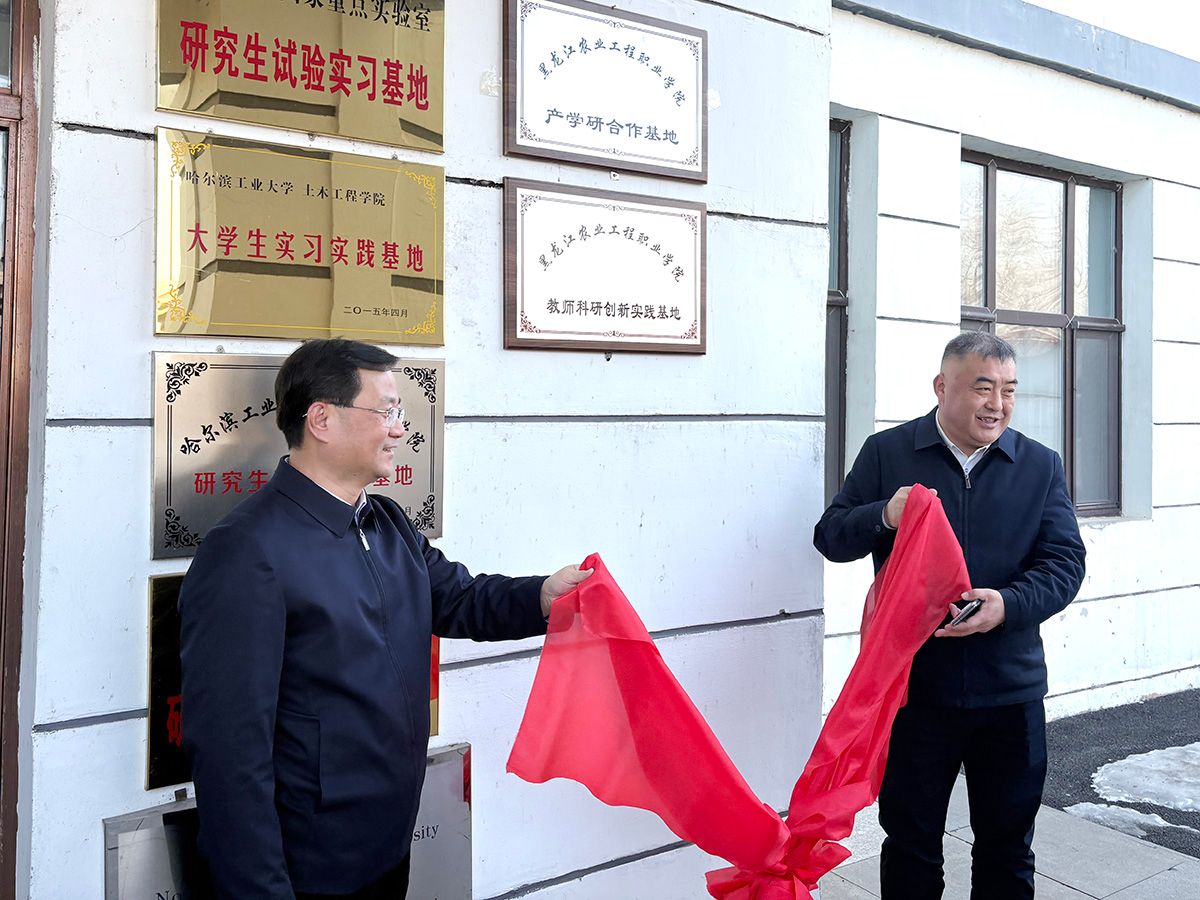 座谈结束后,在省水科院领导的陪同下,我院领导一行参观了科技成果展厅和黑龙江省季节冻土区工程冻土重点实验室,并为“万象城allwincity官网产学研合作基地”和“万象城allwincity官网教师科研创新实践基地”揭牌。通过实地考察交流,我院领导对省水科院在寒区水利工程、冻土研究等领域的前沿科技成果有了更具体地了解,双方就科研合作、技术转化等方面进行了更为具体的探讨,为未来深度合作奠定了坚实的基础。