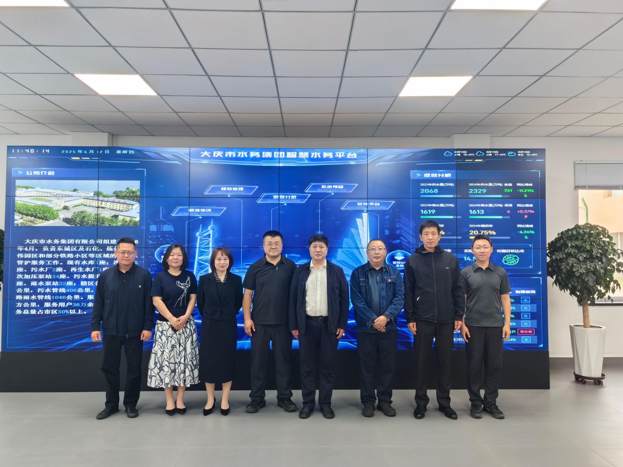 调研人员一行还参观了大庆市水务集团有限责任公司客户服务中心,了解智慧水务综合管理平台运行情况。工作人员现场演示了平台的实时数据监测、数据分析、异常预警等功能。校企双方就平台供水调度优化、管网漏损控制、水质安全预警等实际业务场景中的应用效果进行了深入交流,为后续校企在智慧水务领域的深度合作奠定了良好基础。