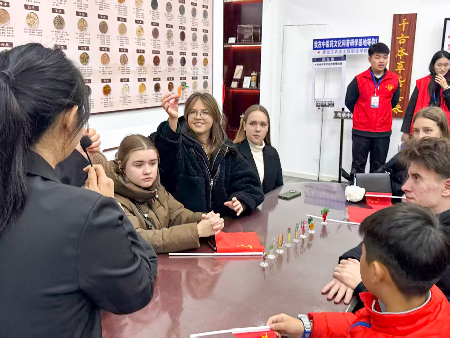 活动中,宣讲团首先向中俄师生介绍了黑龙江省最具代表性的道地药材集群——“龙九味”,借助省级“大创”赛事银奖作品“龙九味”IP卡通形象立牌,进行了一场趣味盎然的“认药PK赛”。同学们在轻松愉快的游戏中,快速掌握了九种药材的形态特征,留下了深刻印象。