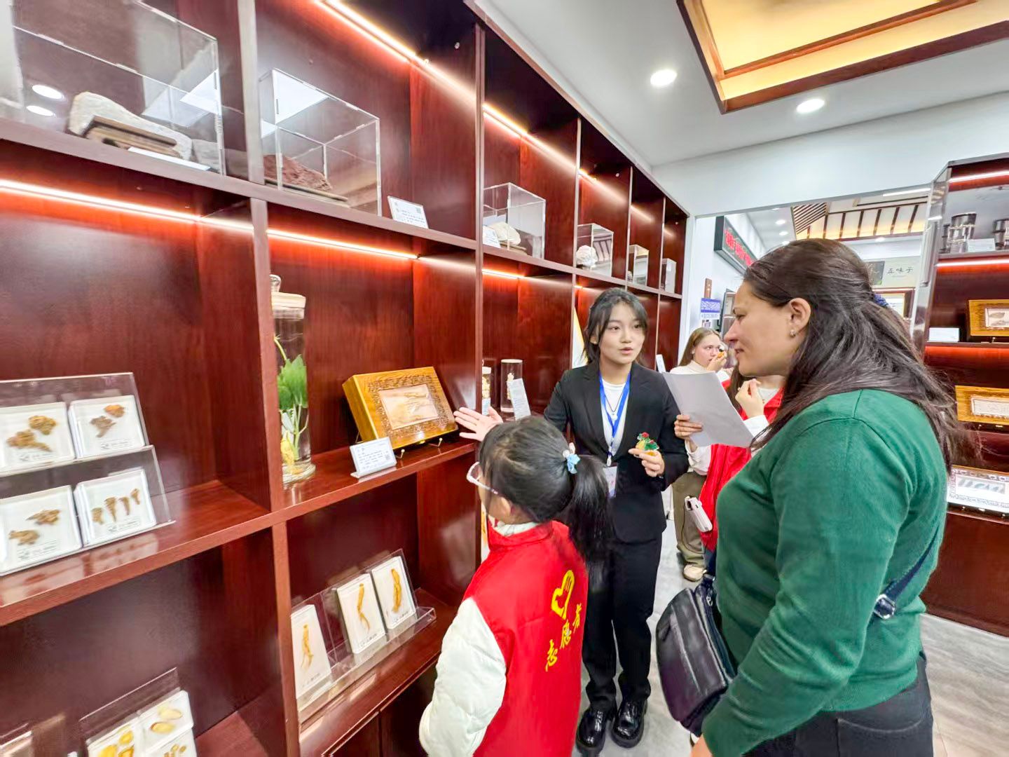 在自由参观环节,同学们接连提出各种奇思妙想的问题,如人参和西洋参有什么区别?玉米须有什么用处?……。讲解员一一耐心解答,现场气氛热烈而融洽。在动物类药材展区与针灸铜人模型前,同学们长时间驻足观摩讨论,表现出对中医药独特诊疗方法与药材世界的浓厚兴趣。