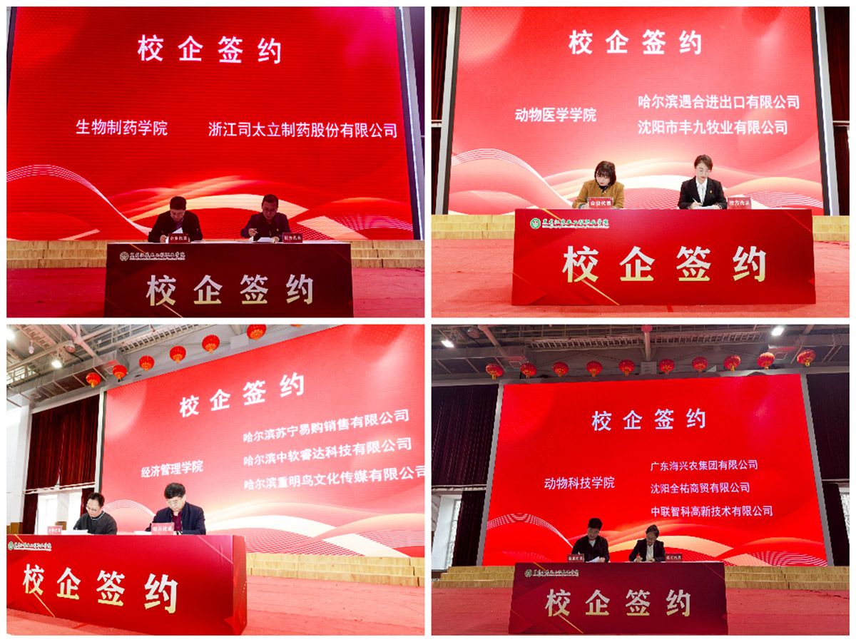 招聘会现场,生物制药学院、动物医学学院、经济管理学院、动物科技学院分别与8家企业签订了校企合作协议,将致力于在人才培养、实习基地建设等方面进行深度合作,为毕业生就业注入长效动能。