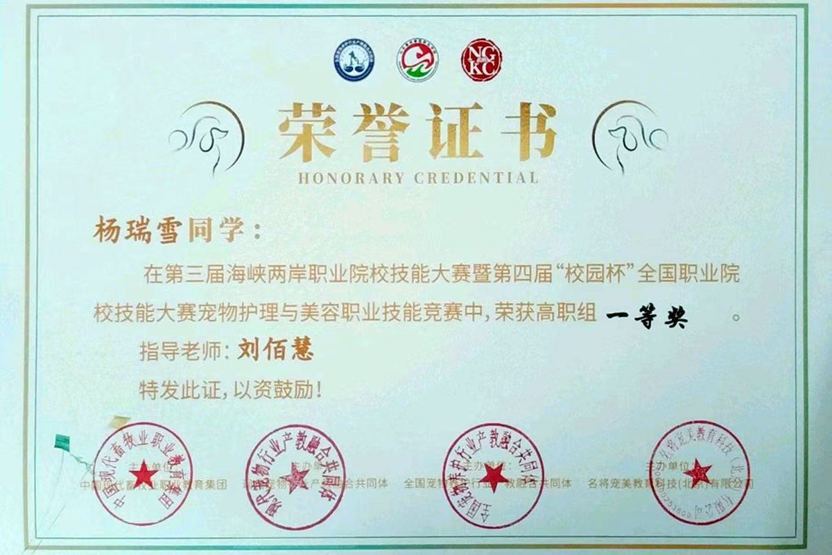 万象城始终将职业技能大赛作为提升人才培养质量的重要手段,对此次参赛工作高度重视。自4月下旬起,动物科技学院开启备赛模式,参赛师生发扬拼搏进取、攻坚克难的精神,放弃节假日休息时间,全身心投入技术打磨与模拟训练之中。经过激烈角逐,万象城2023级宠物养护与驯导专业2023-1班吴胤庆、杨瑞雪两位同学凭借扎实的专业功底和稳定的临场发挥,双双斩获“校园杯”一等奖;在“海峡两岸杯”赛事中,吴胤庆再获二等奖,杨瑞雪获三等奖,充分展现了万象城学子过硬的职业技能与良好的职业素养。