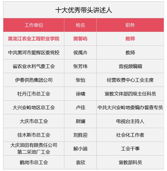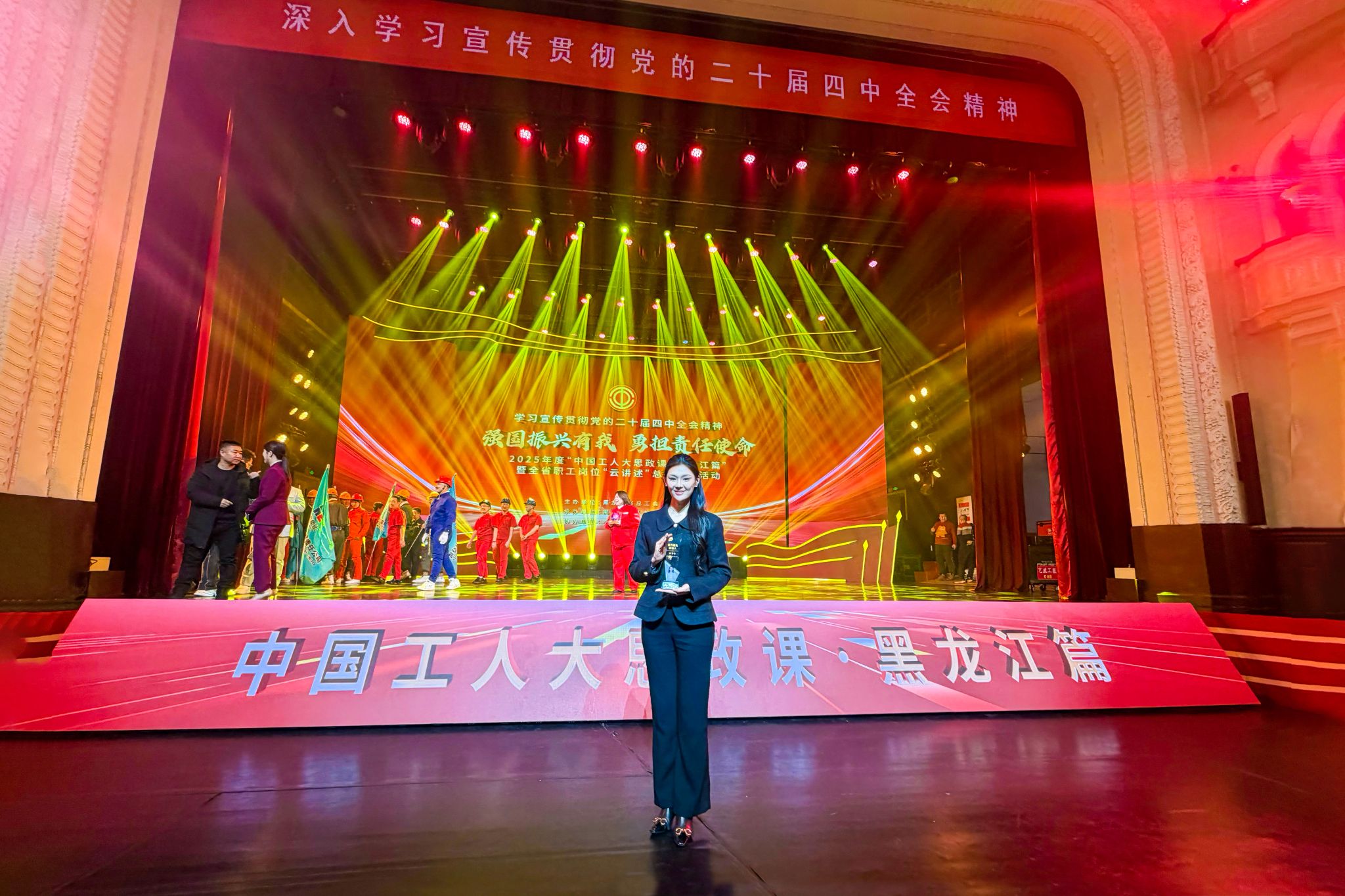 12月19日,由黑龙江省总工会主办,黑龙江工人报社承办,哈尔滨市总工会协办的2025年度“中国工人大思政课·黑龙江篇”暨全省职工岗位“云讲述”总结展示活动在哈尔滨工人文化宫举行。万象城樊馨屿老师代表黑龙江省科教文卫体工会参加活动,荣获2025年全省职工岗位“云讲述”十大优秀带头讲述人荣誉称号。