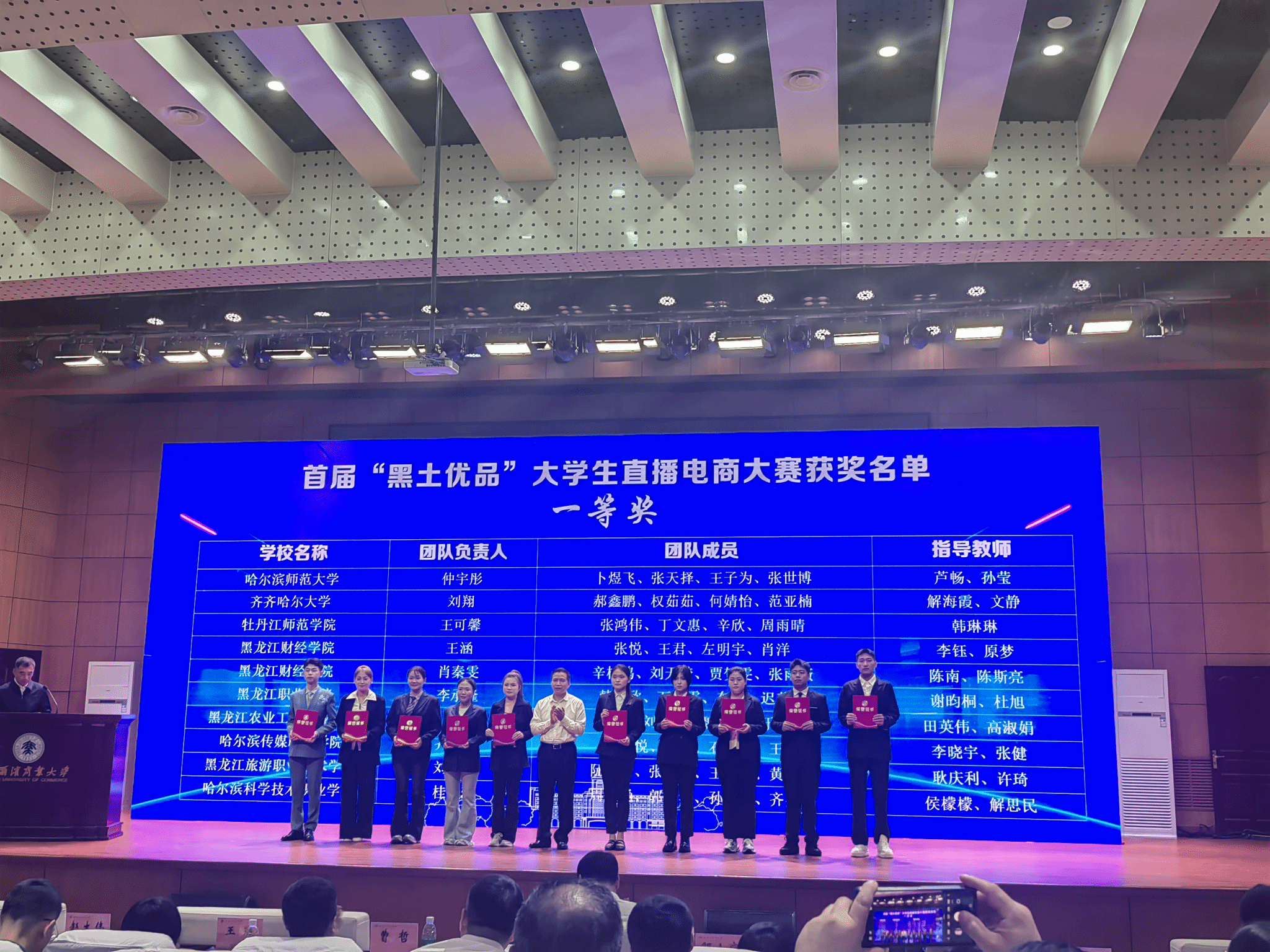 2025年5月24日,由黑龙江省教育厅等部门主办的首届“黑土优品”大学生直播电商大赛直播路演活动在哈尔滨国际会展中心“黑土优品”展示运营中心E馆落下帷幕。在黑土优选大赛决赛路演中,我院田英伟、高淑娟老师指导的电商专业刘洋团队,在全省十个一等奖团队的PK中凭借出色表现斩获第二名(银奖),同时被聘为黑土优品农产品甄选推荐官,颁奖和授牌仪式在哈尔滨商业大学举行。