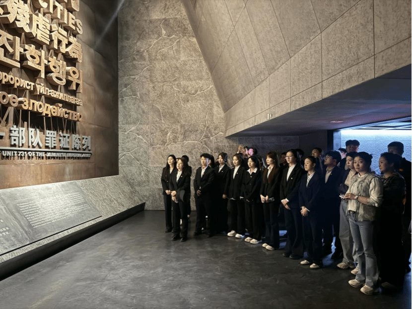 活动当日,同学们怀着沉重的心情抵达陈列馆。这座位于黑龙江省哈尔滨市平房区新疆大街47号的遗址型博物馆,如同一座历史的警钟,静静诉说着那段黑暗而惨痛的岁月。其建筑设计独具匠心,外部冷酷的黑色系和棱角分明的主体结构,恰如七三一部队反人性罪行的无声象征,还未踏入馆内,便让同学们感受到了历史的沉重。