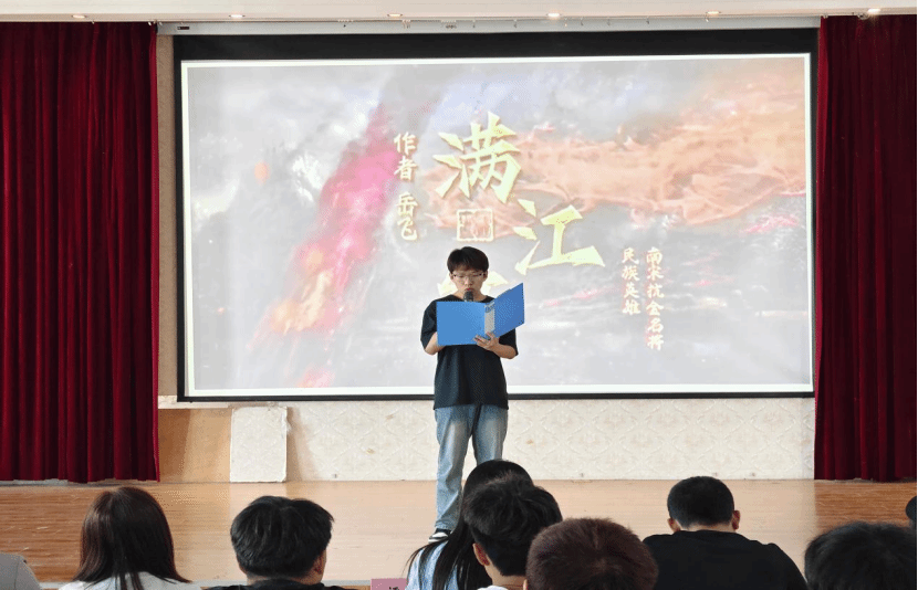 冯子昂再次演绎《满江红》,激昂的诵读让经典的力量再次激荡全场师生的心灵。