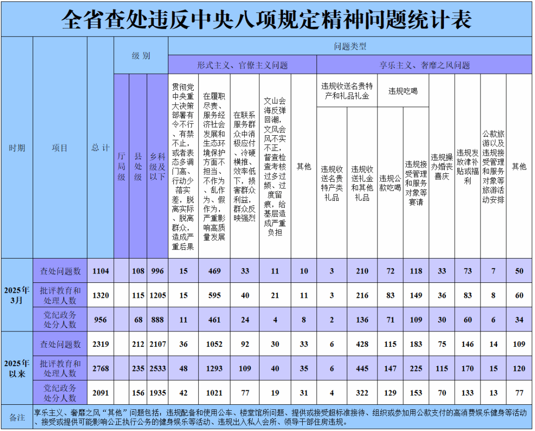 2025年3月,黑龙江省纪检监察机关共查处违反中央八项规定精神问题1104起,批评教育和处理1320人,其中党纪政务处分956人。