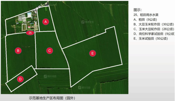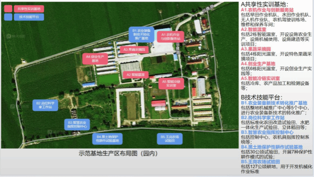 基地拥有农机作业与创新服务站、黑土地保护性耕作研究院及试 验基地、农机装备新技术转化推广基地、节能温室组群、智能温室组 群、岗位科学家试验田、技能大师工作室、农业装备中试基地、中小 学研学教育基地、王岗试验农场等10余个部分组成。总面积145万平方米,约合2100亩,主要种植玉米、大豆。另有13栋智能温室和节能 温室,棚室面积约4000平方米,主要种植蔬菜、果树、花卉和食用菌。