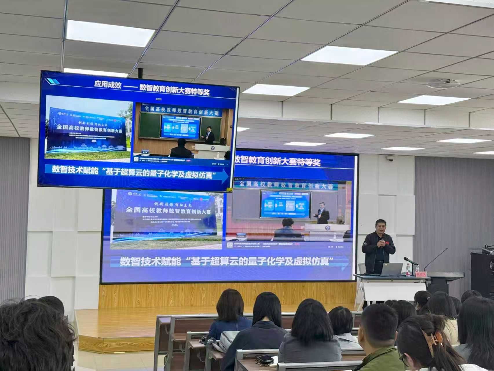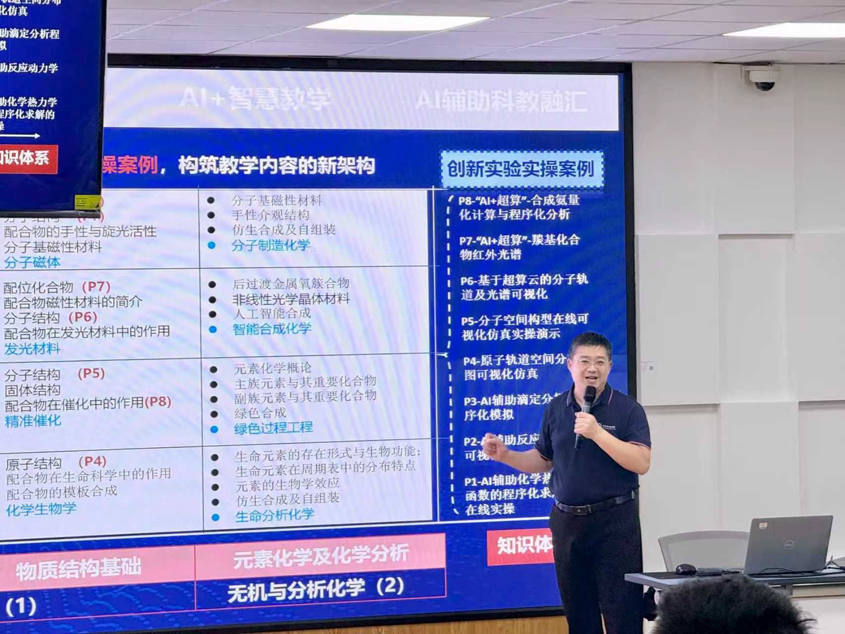 培训中,张兴文教授以首届全国高校教师数智教育创新大赛特等奖案例为切入点,围绕“人工智能在数智教学中的创新设计与应用实践”这一核心主题展开深度讲解。他聚焦“AI+”与“+AI”双轨融合模式,结合自身创建化学智慧教学空间网络平台、开发化学类AI课程和学科专属智能体,创设“大模型与智能体:AI for Chemistry”的实践经验,系统阐述了如何借助学科领域大模型,构建面向具体学科的多智能体教学体系与智能化课程资源库。