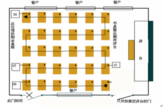 4.考场桌椅摆放要求:每个考场摆放30套桌椅,5列6排摆放,座位须单人、单桌排列,间距80厘米以上,桌屉清空后朝讲台方向放置,多余桌椅整齐摆放在后面,桌椅摆放见样图。