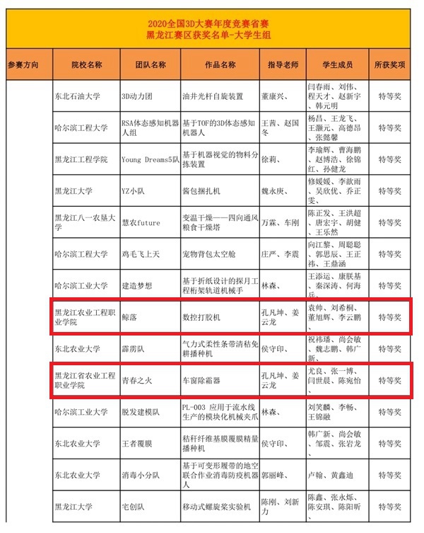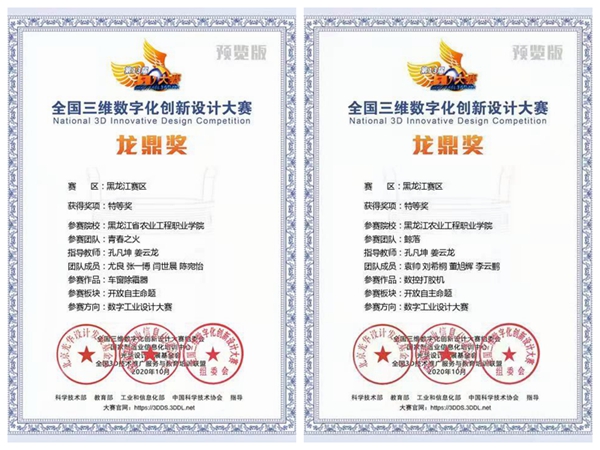 全国3D大赛等级高、规模大,是我国高校竞赛排行榜列入的重点大赛项目之一。我院与哈工大等省内本科高校同台竞技,我院机械工程参赛团队不畏强手、敢于拼搏、勇争上游,充分展现出团结奋进、积极向上的精神风貌。在数字工业设计赛项中,我院参赛创新作品《数控打胶机》和《车窗除霜器》荣获特等奖,《便携式电动起钉设备》荣获二等奖,《新型公路减速带》荣获三等奖,18名参赛选手全部获奖。