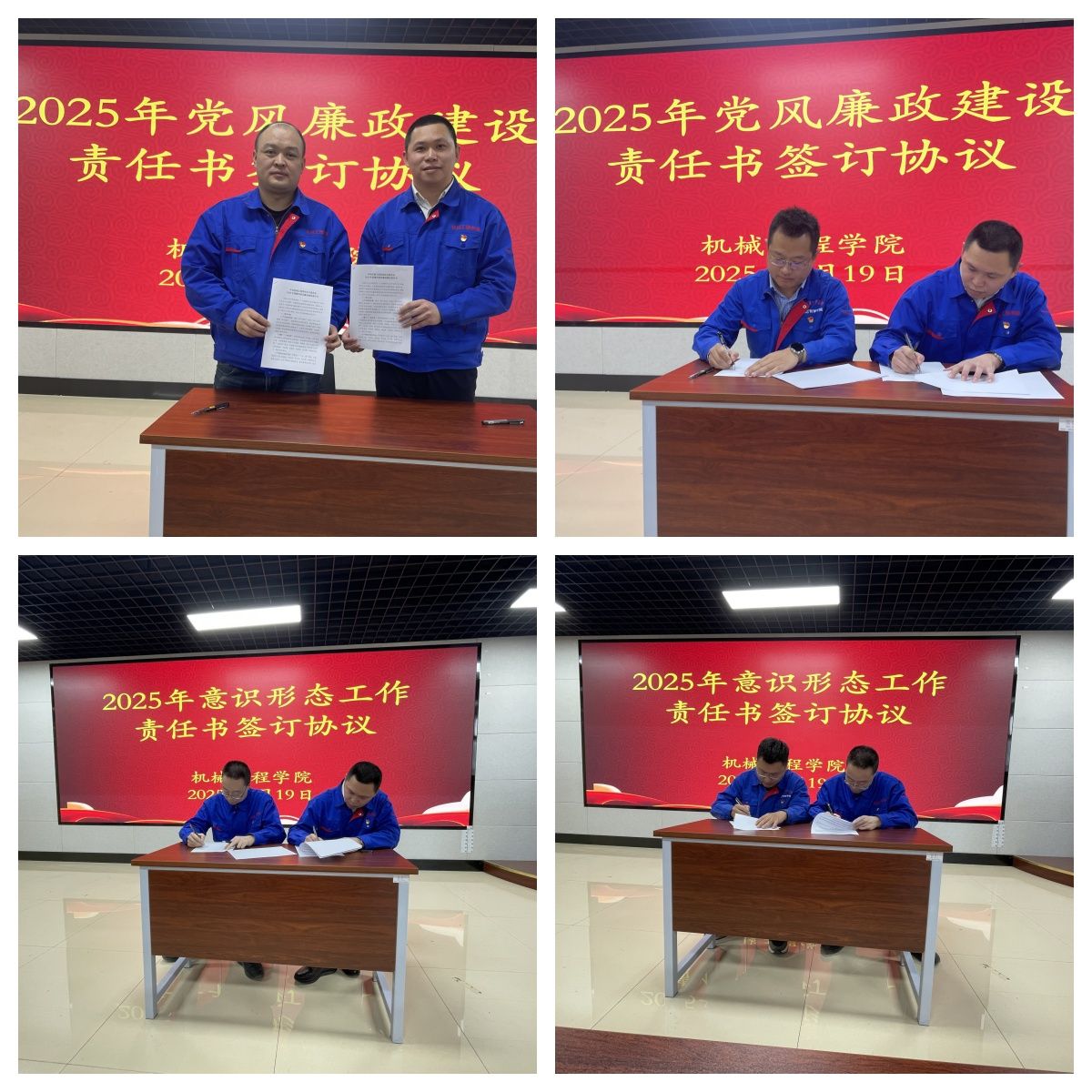 随后,会议进行了党风廉政建设和意识形态工作责任状签订仪式。杜广欣书记分别与班子成员代表副院长鄢长卿和党支部书记代表张栋签订了2025年党风廉政建设责任书,明确了各级领导干部在党风廉政建设中的职责和任务,进一步压实了党风廉政建设主体责任。在2025年意识形态工作责任书签订仪式上,杜广欣书记与班子成员代表副书记杨大川签订了责任书,杨大川副书记与辅导员代表孙帅签订了责任书,逐级落实意识形态工作责任制,确保机械工程学院意识形态领域安全稳定。