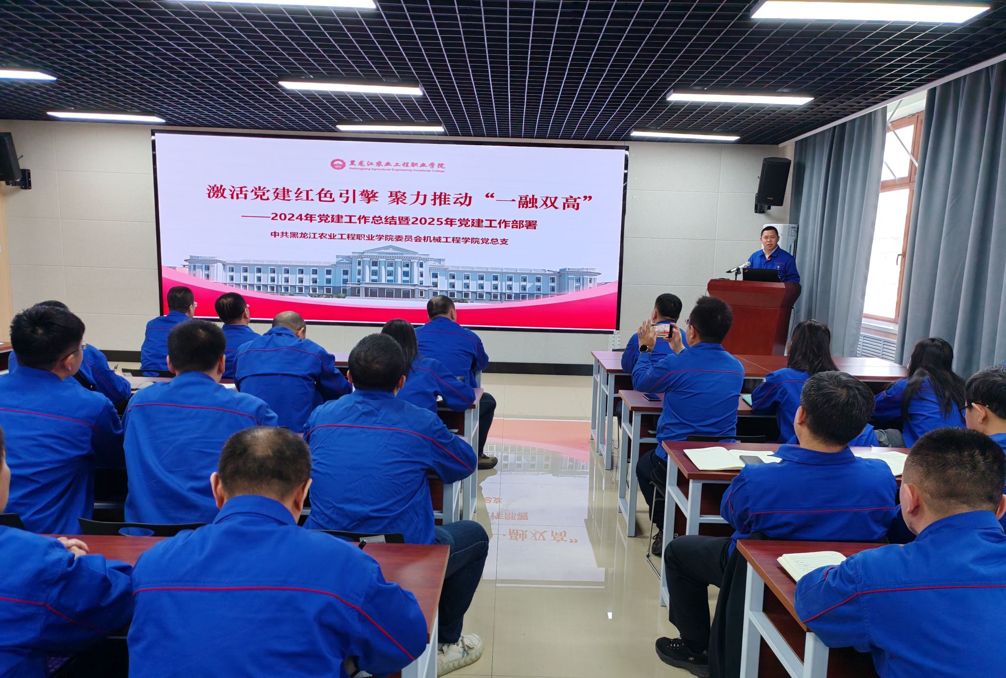 随后,党总支书记杜广欣对2024年党建工作进行了全面总结,并对2025年党建工作任务进行了详细部署,此外,在安全稳定工作方面,他要求全体教职工认真落实近期学院关于实习工作的检查和安排,他强调,要高度重视实习、就业的各个环节,坚决把责任落实到人,把任务落实到岗,把措施落实到位。在2024年党建工作总结中,杜书记指出,过去一年,学院党总支坚持以习近平新时代中国特色社会主义思想为指导,深入贯彻落实党的二十大和二十届三中全会精神,全面加强党的建设,取得了显著成效。教师党支部入选全国高校“双带头人”教师党支部书记“强国行”专项行动团队;1个团队入选哈尔滨亚冬会志愿服务项目;1个案例入选机械行业职业教育2023年度优秀产科教融合发展成果;1个案例入选2023年教育赋能乡村振兴典型案例;1名教师党员获评享受国务院政府特殊津贴专家荣誉称号。2025年,机械工程学院党建工作要紧紧围绕学院党委中心工作,以高质量党建引领学院高质量发展,加强党的政治建设、思想建设、组织建设、作风建设、纪律建设,把制度建设贯穿其中,深入推进反腐败斗争,不断提高党的建设质量,为学院事业发展提供坚强政治保证。