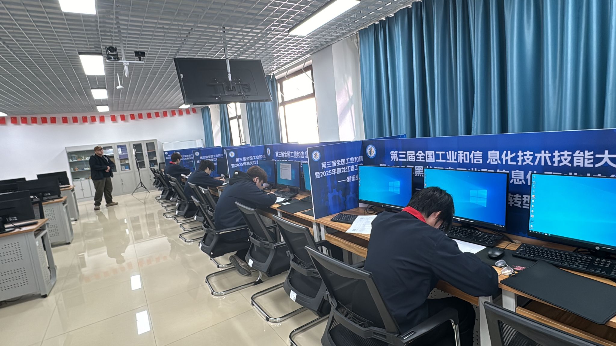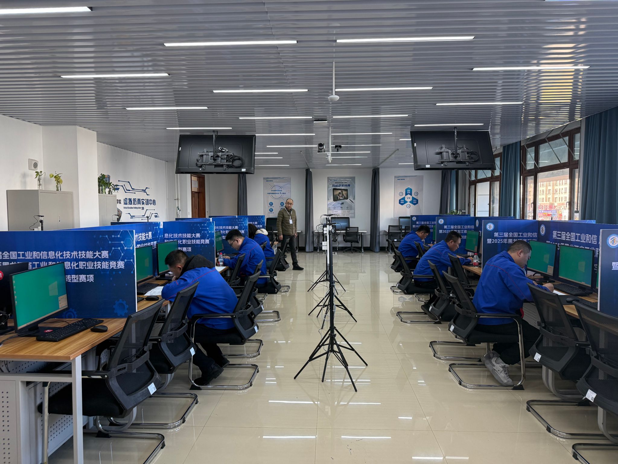 备赛阶段,师生热情高涨,利用课余与工作间隙开展技术研讨、模拟实操,围绕NX软件操作、PLC程序设计与仿真、工业网络相关知识等核心内容刻苦钻研,尽显对技能提升的执着。比赛过程中,理论考试环节,选手们围绕赛事相关政策、软件原理及编程逻辑等内容精准作答;实操环节聚焦技术核心,选手们熟练运用NX软件完成数字化仿真操作,同步开展PLC程序编写、工业网络配置等核心模块,在规定时间内高效完成任务。