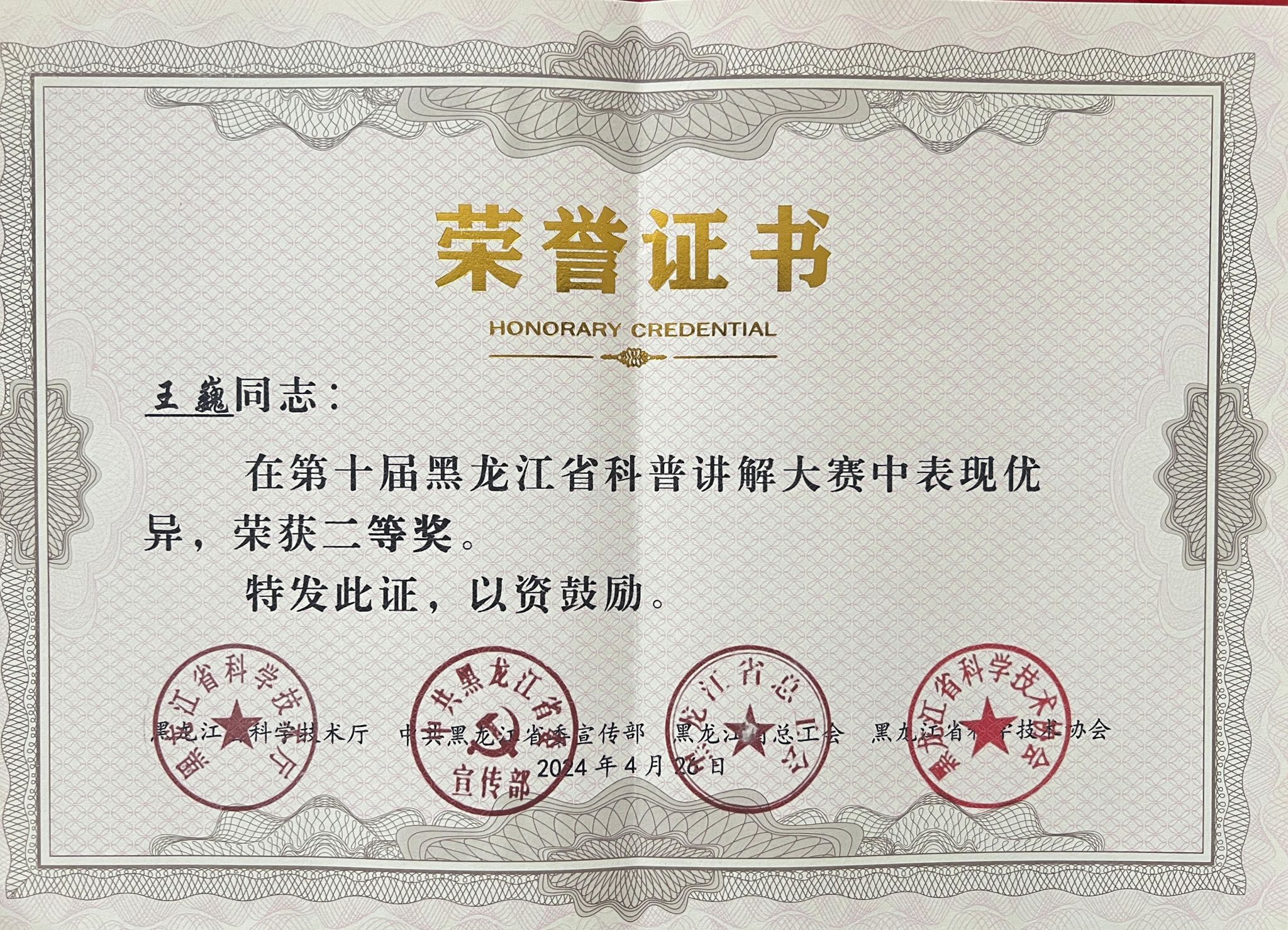2024年4月26日,由省科技厅、省委宣传部、省总工会、省科协主办的“第十届黑龙江省科普讲解大赛”在深哈产业园成功举办。我院选送的王巍老师在126名选手中脱颖而出,以决赛第五名的成绩获得二等奖,同时获得了2024年“第十届黑龙江省科普讲解大赛”十佳科普使者称号。