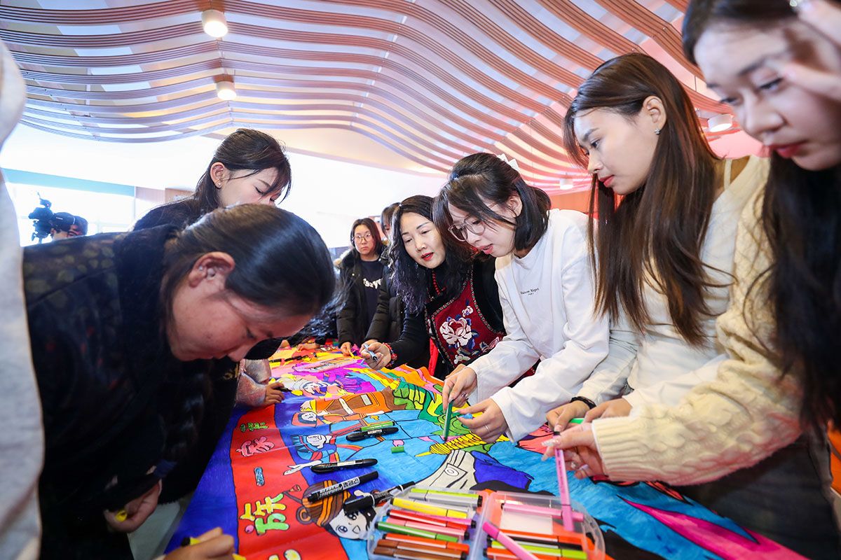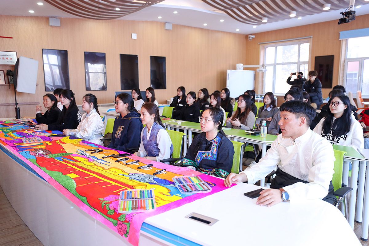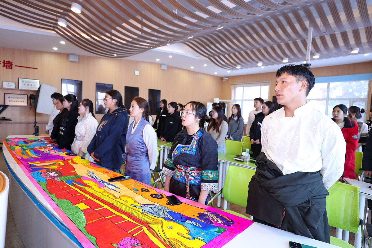 在“同画一个家”环节,师生在巨幅画纸上勾勒出充满爱与温暖的民族团结大家庭画面。
