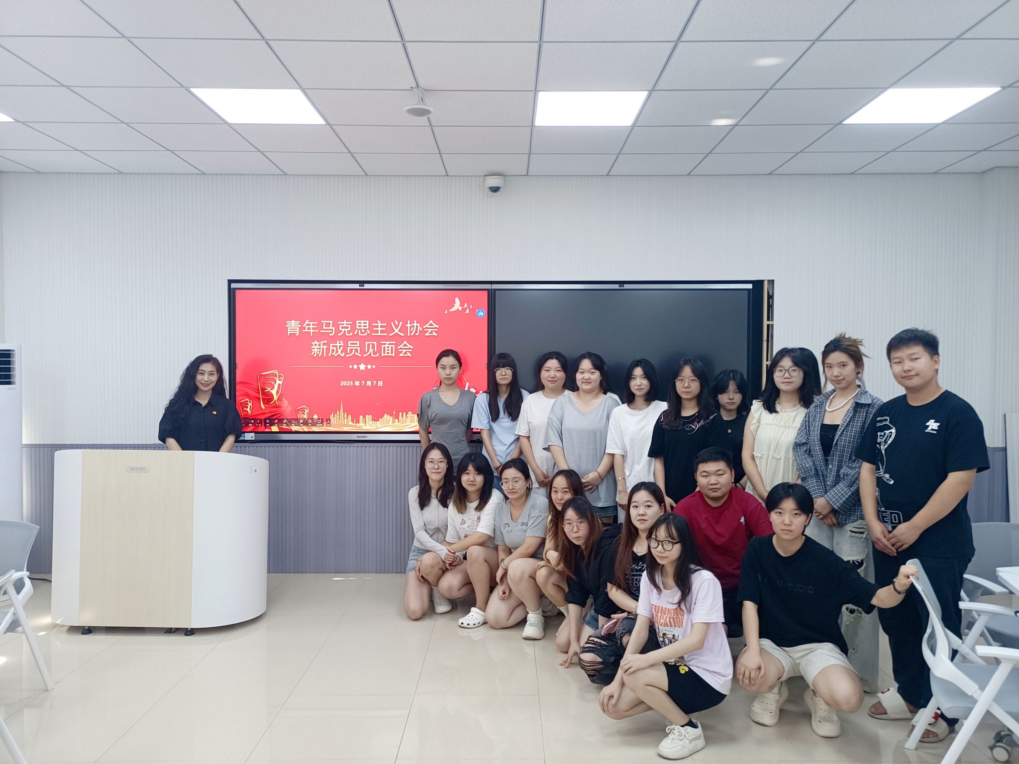 7月7日,在这个具有深远历史意义的日子里——全民族抗战爆发88周年纪念日,2025级青年马克思主义协会(以下简称“青马协会”)新成员见面会暨“信仰之光”马克思主义公开课在教学楼212智慧教室成功举行。本次活动由青马协会负责人、2023级商务日语二班王美轶同学主持。青马协会指导教师、马克思主义学院孟靓莹老师与全体新成员共同参加了本次活动,在铭记历史、缅怀先烈的氛围中,开启了坚定信仰、追求真理的新征程。