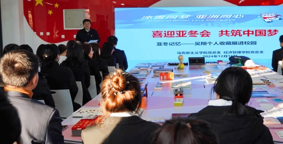 活动中,吴翔向与会师生介绍了参加第三届亚冬会的亲身体会、收藏展品的真实情感和由衷而发地对伟大祖国的热爱,深情讲述每一件藏品背后的故事。与会师生纷纷表示,通过此次活动,更加深入了解了亚冬会的故事、龙江高质量发展的故事,讲好龙江故事,传播中国好声音,我们要一路前行。