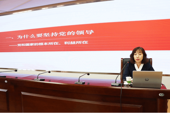 蔺彩娜老师从国际与国内两个角度,细致讲解和阐释了“为什么要坚持党的领导”和“怎样理解党的领导是全面的、系统的、整体的”两个问题。蔺彩娜老师结合苏联亡党亡国的惨痛教训,结合我国百年奋斗的非凡历程,将坚持党的全面领导置于科学社会主义的基本原理中去认识,置于国际共产主义运动的历史经验教训中去分析,置于中国共产党领导中国社会的发展中去把握,带领大家深刻认识中国共产党领导是中国特色社会主义最本质的特征,中国特色社会主义是科学社会主义基本原则同当代中国实际和时代特征相结合的产物。蔺彩娜老师从热点辨析问题中讲解“党中央是坐镇中军帐的‘帅’”,强调坚持党的全面领导就是要提高党把方向、谋大局、定政策、促改革的能力。