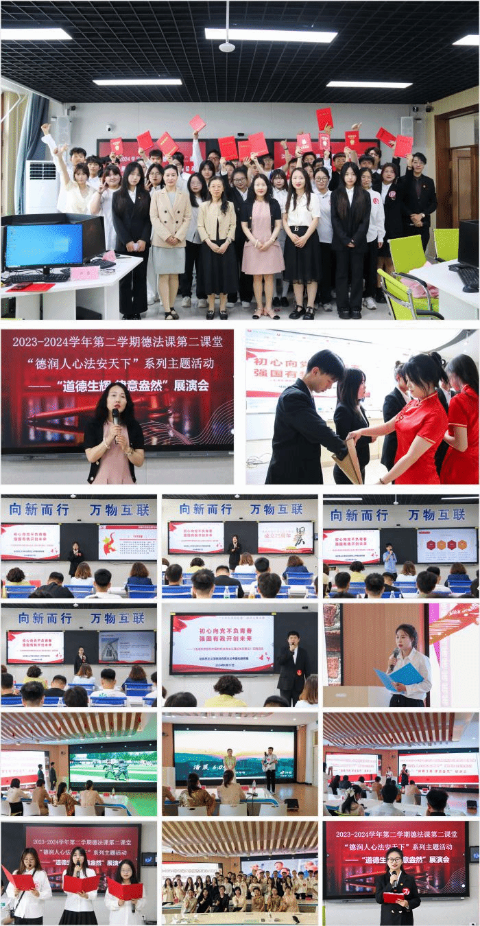 思想道德与法治教研室组织开展了“德润人心 法安天下”系列主题活动之——“道德生辉 律意盎然”展演会。铭法于心,学法力行。作为《思想道德与法治》课堂教学的延伸,此次思政实践课教学成果展演,以“思政+艺术”模式生动展现,以“讲身边事,学基本法,做明白人”为主题,围绕法、理、情等方面,对身边常见的法律事件、道德热点进行深入分析、演绎和评析,将艺术融入思政课堂,有效提升了课程的趣味性和实效性,更让学生在参与中深化了对道德和法律的理解。展演会上,学生们通过唱响道德法治之歌、有声演播、演讲、诗朗诵、情景剧和乐器演奏等形式,展现了道德的光芒和法律的力量。其中,《无名的人》《我的中国心》等歌曲传达了道德情操和法治精神;《心中有戒尺,方能扬帆远航》《以道德之光照亮人生》等作品,则通过演讲展现了法律的神圣和公正。此外,学生们还结合PPT图文,对法律事件进行了生动的讲解,让在场的师生们深受触动。