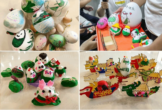 在“传承习俗动巧手”和“端午活动共体验”环节中,师生共同绘制端午彩蛋、捏黏土创意粽子、拼龙舟。学生们充分发挥创造力和想象力,将鸡蛋变成一件件富有艺术感和文化内涵的作品。大家兴致勃勃地参与“投壶”等端午经典活动,或瞄准、或投掷,每一次成功的投中都引发阵阵欢呼,现场气氛热烈,欢声笑语回荡整个校园。